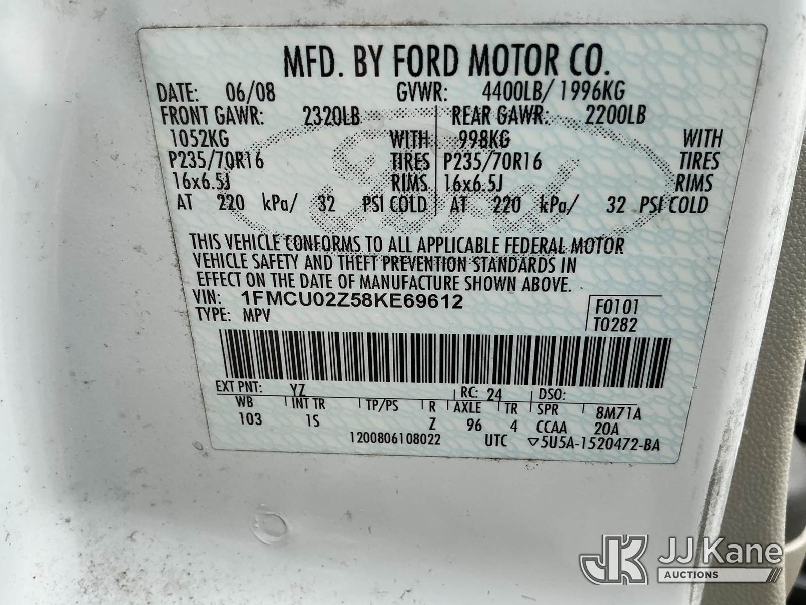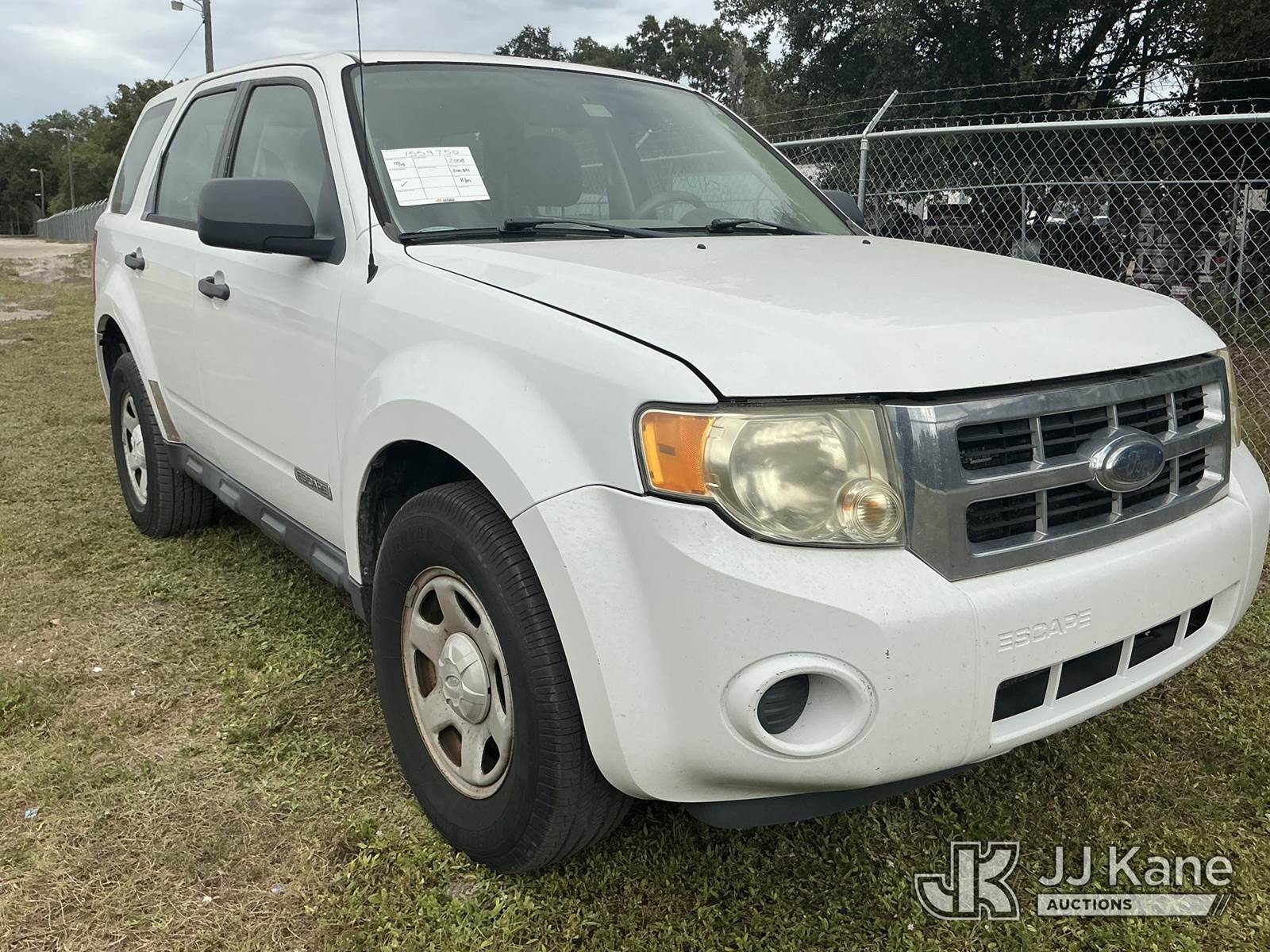 2008 Ford Escape Sport Utility Vehicle, 4-cyl, 4-Speed Automatic, FWD, gas, A/C, (200,891 miles (unverified)) State of FL Unit (Runs & Moves) (Jump To Start)(Exempt from Odometer Disclosure) (FL Residents Purchasing Titled Items - tax, title & registration fees will be collected at the maximum rate of $400.00 under 25,999 and $800.00 for Over 26,000 and $250.00 trailers - Proof of insurance is mandatory; Out of State Residents Purchasing Title Items - tax will be collected based upon your state rate.) This is a Titled Item NOTE: This unit is being sold AS IS/WHERE IS via Timed Auction and is located in Thonotosassa, FL. Inspection & preview days for this unit are the 2 business days prior to the first day of items closing for this auction, item is located at 11720 N US 301 Thonotosassa, Fl 33592 and hours of operations are 8a-4p. For pre-sale questions, please contact Office Staff @ (813) 986-2485. (Buyer is responsible for removal. Assistance by consignor or JJ Kane Auctioneers is not assured.)