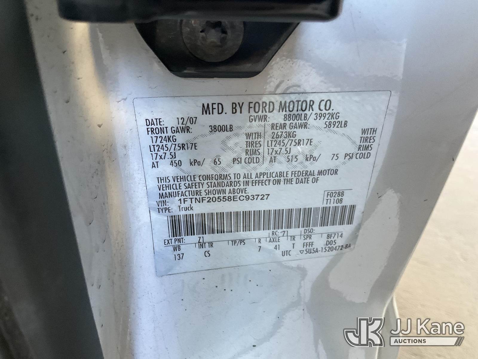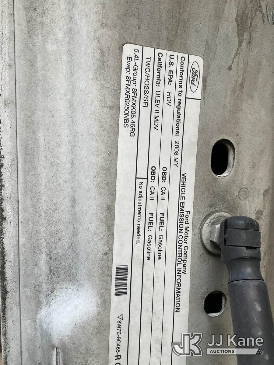 2008 Ford F-250 SD Pickup Truck, s/n 1FTNF20558EC93727, 8-cyl gas, 5-Speed Automatic, A/C, with Tow package, (119,165 miles) (Runs & Moves) This is a Titled Item NOTE: This unit is being sold AS IS/WHERE IS via Timed Auction and is located in Jurupa Valley, CA. Inspection & preview days for this unit are the 2 business days prior to the first day of items closing for this auction, item is located at 4510 Muth Way Jurupa Valley, CA 92509 and hours of operations are 8a-4p. For pre-sale questions, please contact please contact Office Staff @ (310) 353-7140. Dealer License Number 45696. (Buyer is responsible for removal. Assistance by consignor or JJ Kane Auctions is not assured.)