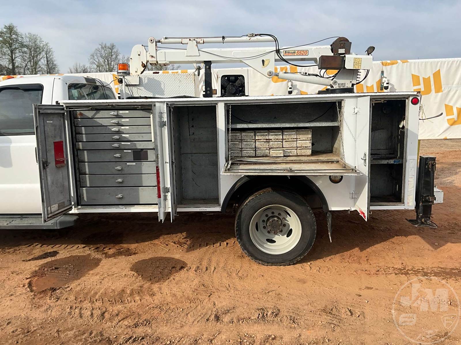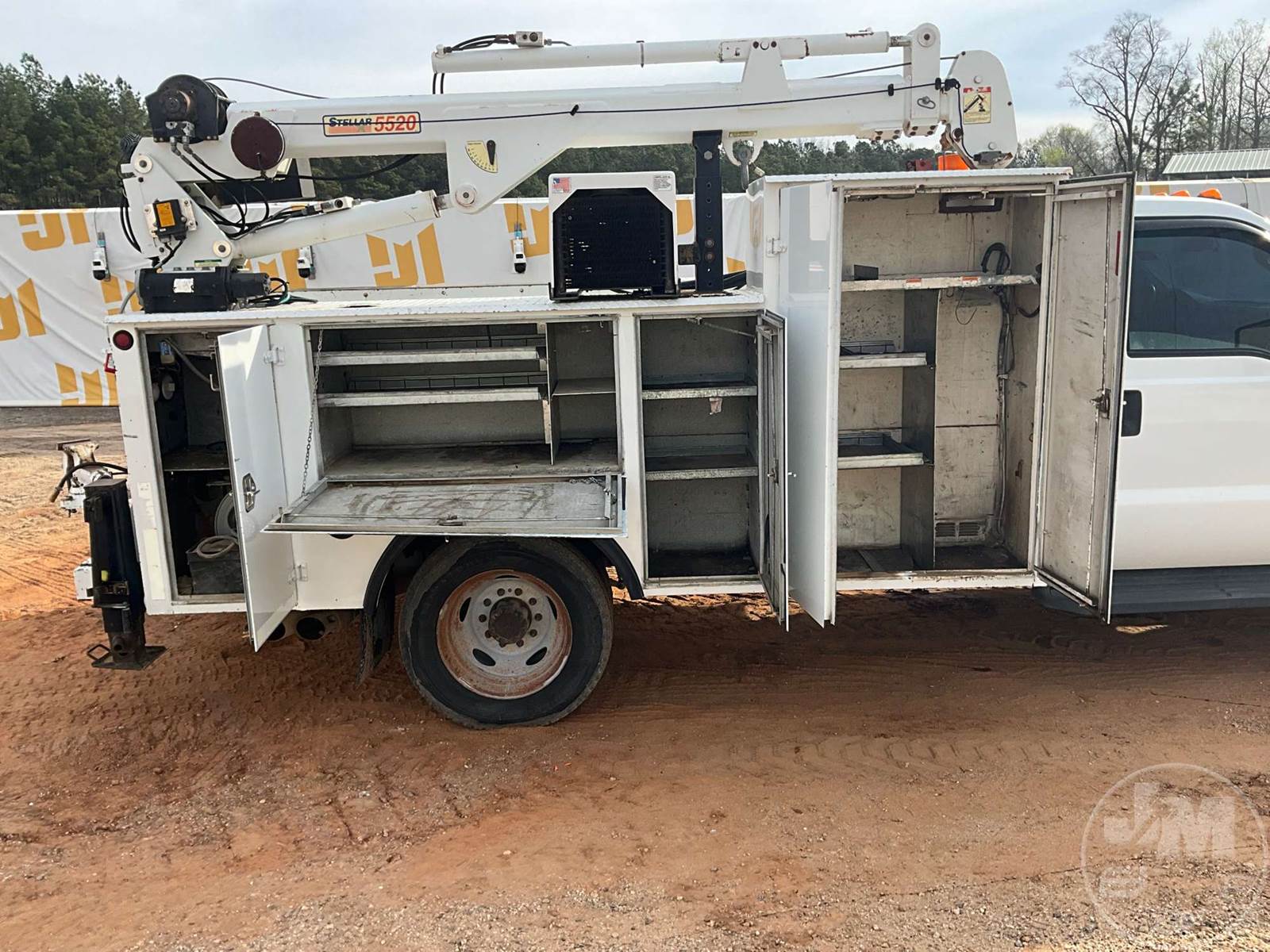 S/A MECHANICS TRUCK, POWERSTROKE 6.4L, AUTOMATIC, SPRING SUSPENSION, GVWR 13660, IMT, 12' UTILITY BODY, STELLAR, 5520C-12V, 5000 LB CAPACITY CRANE, CRANE REACH 21.5', MANUAL OUTRIGGERS, HYDRAULIC AIR COMPRESSOR, HOSE REEL, CRUISE CONTROL, VISE, STEEL DISC WHEELS, 225/70R19.5 TIRES, ODOMETER READS: 134564, ***REMOTE LOCATED IN CHECKOUT***