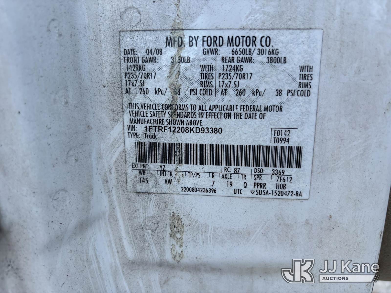 2008 Ford F150 Pickup Truck, 6-cyl gas, Auto, A/C, with service cap, (79,119 miles) (Runs & Moves) (Check Engine Light On, Trans Issues, Body/Paint Damage) (FL Residents Purchasing Titled Items - tax, title & registration fees will be collected at the maximum rate of $400.00 under 25,999 and $800.00 for Over 26,000 and $250.00 trailers - Proof of insurance is mandatory; Out of State Residents Purchasing Title Items - tax will be collected based upon your state rate.) This is a Titled Item NOTE: This unit is being sold AS IS/WHERE IS via Timed Auction and is located in Westlake, FL. Inspection & preview days for this unit are the 2 business days prior to the first day of items closing for this auction, item is located at 4003 Seminole Pratt Whitney Rd Westlake, FL 33470 and hours of operations are 8a-4p. For pre-sale questions, please contact: Matt Johnson @ (205) 847-9106. (Buyer is responsible for removal. Assistance by consignor or JJ Kane Auctioneers is not assured.)