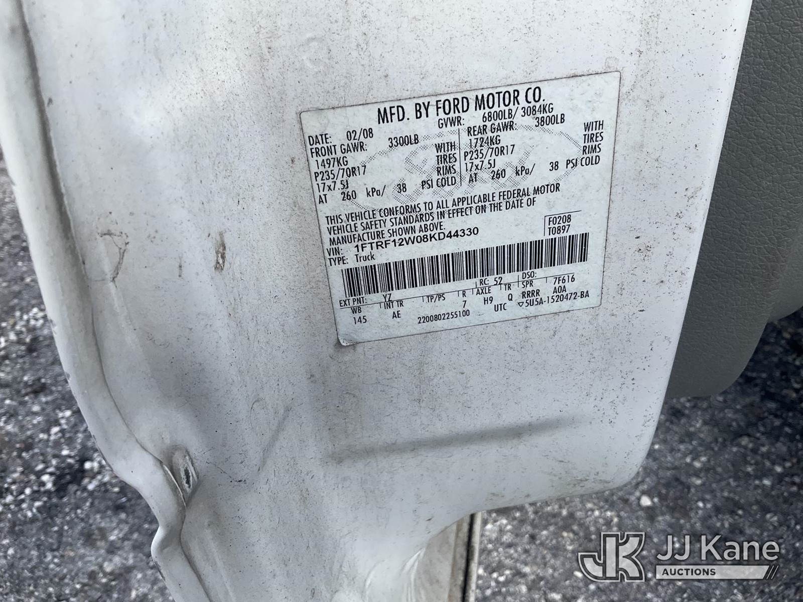 2008 Ford F150 Pickup Truck, 4.6L V8 SOHC 16V gas, Auto, RWD, A/C, True Mileage Unknown (Not Running, Condition Unknown) (No Key, Paint Damage) This is a Titled Item NOTE: This unit is being sold AS IS/WHERE IS via Timed Auction and is located in Thonotosassa, FL. Inspection & preview days for this unit are the 2 business days prior to the first day of items closing for this auction, item is located at 11720 N US 301 Thonotosassa, Fl 33592 and hours of operations are 8a-4p. For pre-sale questions, please contact Office Staff @ (813) 986-2485. (Buyer is responsible for removal. Assistance by consignor or JJ Kane Auctions is not assured.)
