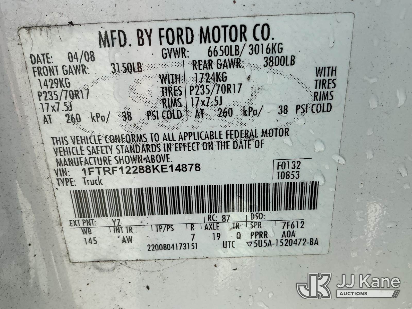 2008 Ford F150 Pickup Truck, 6-cyl gas, Auto, A/C, (148,734 miles) (Runs & Moves) This is a Titled Item NOTE: This unit is being sold AS IS/WHERE IS via Timed Auction and is located in China Grove, NC. Inspection & preview days for this unit are the 2 business days prior to the first day of items closing for this auction, item is located at 820 E NC Hwy 152 China Grove, NC 28023 and hours of operations are 8a-4p. For pre-sale questions, please contact Office Staff @ (704) 674-1113. (Buyer is responsible for removal. Assistance by consignor or JJ Kane Auctions is not assured.)