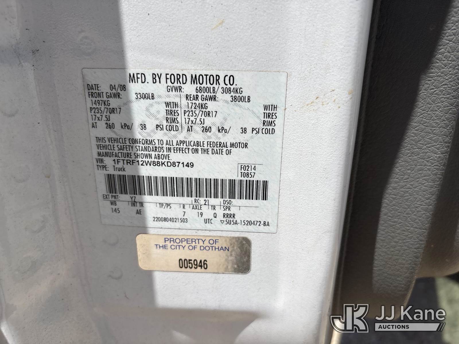 2008 Ford F150 Pickup Truck, 4.6L V8 SOHC 16V gas, RWD, Auto, A/C, (130,433 miles) (Municipality Owned) (Runs & Moves) (Check Engine Light On, ABS Light On) This is a Titled Item NOTE: This unit is being sold AS IS/WHERE IS via Timed Auction and is located in Dothan, AL. For more information & removal arrangements please contact Dylan Evans @ 205-936-1094. Alabama Auctioneer Michael Whitebread - License # 5592. (Buyer is responsible for removal. Assistance by consignor or JJ Kane Auctions is not assured.)