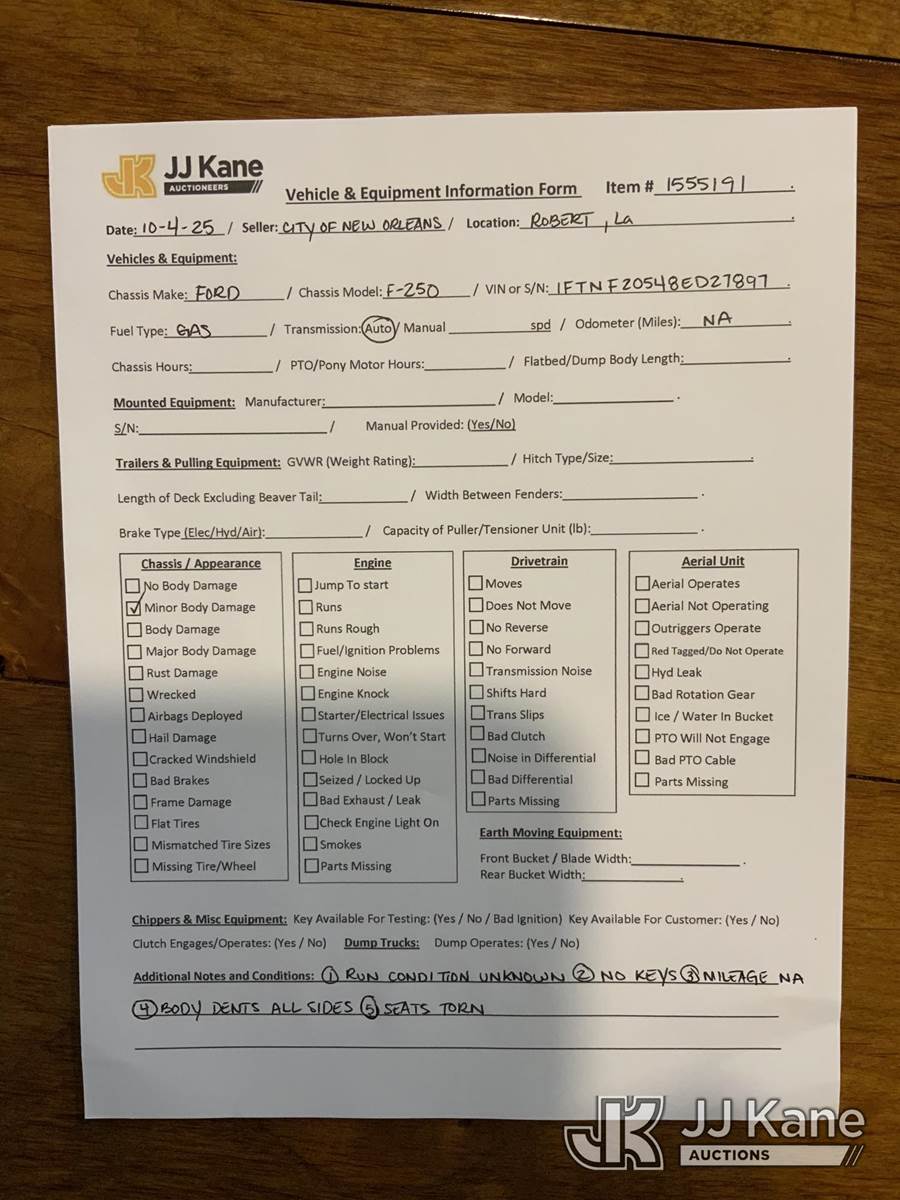 2008 Ford F250 Pickup Truck, 8-cyl gas, Auto, A/C, True Mileage Unknown (Not Running, Condition Unknown) (No keys, Interior Damage, Body/Paint Damage) This is a Titled Item NOTE: This unit is being sold AS IS/WHERE IS via Timed Auction and is located in Robert, LA. Inspection & preview days for this unit are by appointment only; please contact us at contact@jjkane.com or 84-Go-JJKane for more details. License # LA AB-154 (Buyer is responsible for removal. Assistance by consignor or JJ Kane Auctions is not assured.)