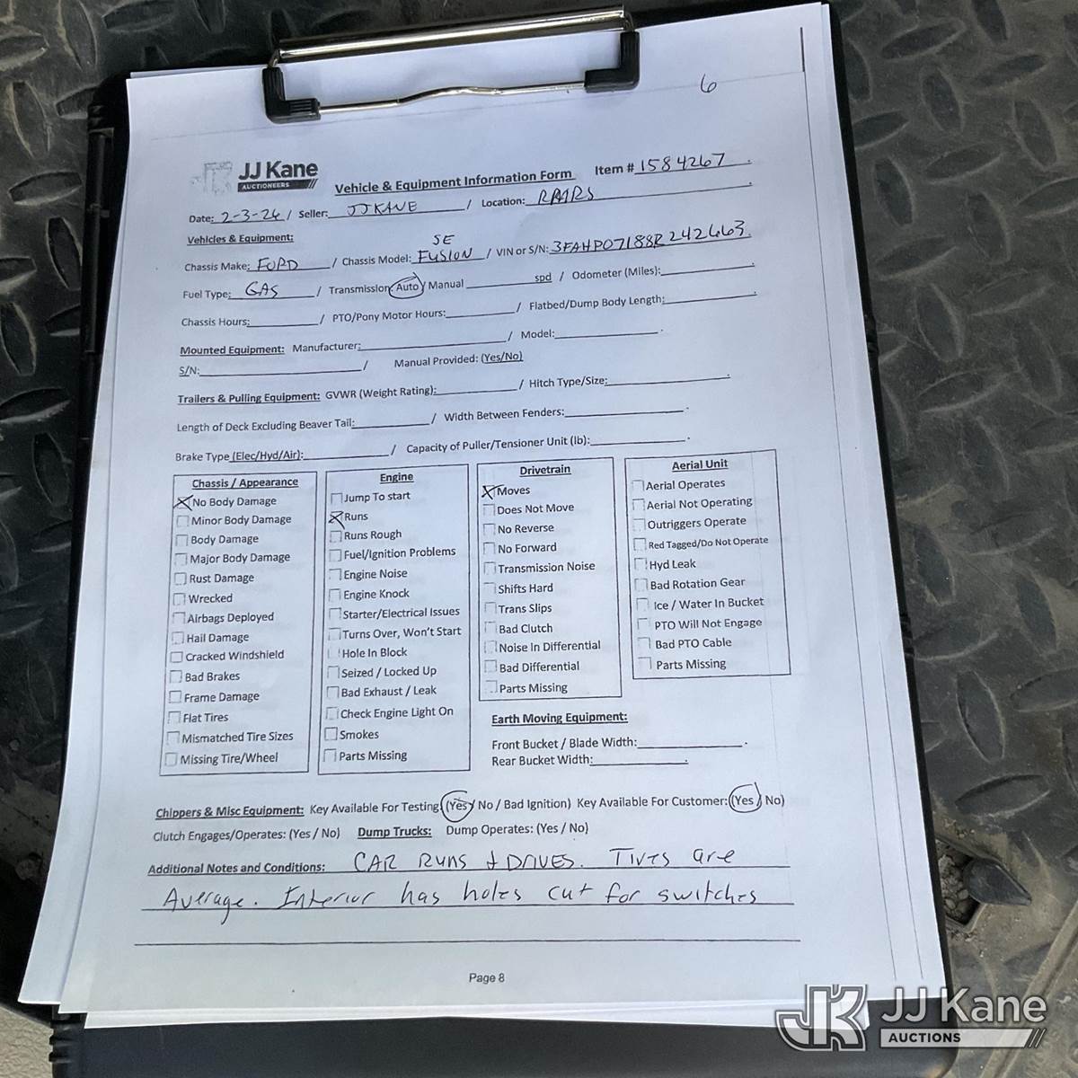 2008 Ford Fusion SE 4-Door Sedan, 6-cyl gas, FWD, Gas, Auto, A/C, (113,841 miles) (Runs & Moves)) This is a Titled Item NOTE: This unit is being sold AS IS/WHERE IS via Timed Auction and is located in Grand Junction, CO. For more information & removal arrangements please contact John Larkin @ 720-390-9897. (Buyer is responsible for removal. Assistance by consignor or JJ Kane Auctions is not assured.)