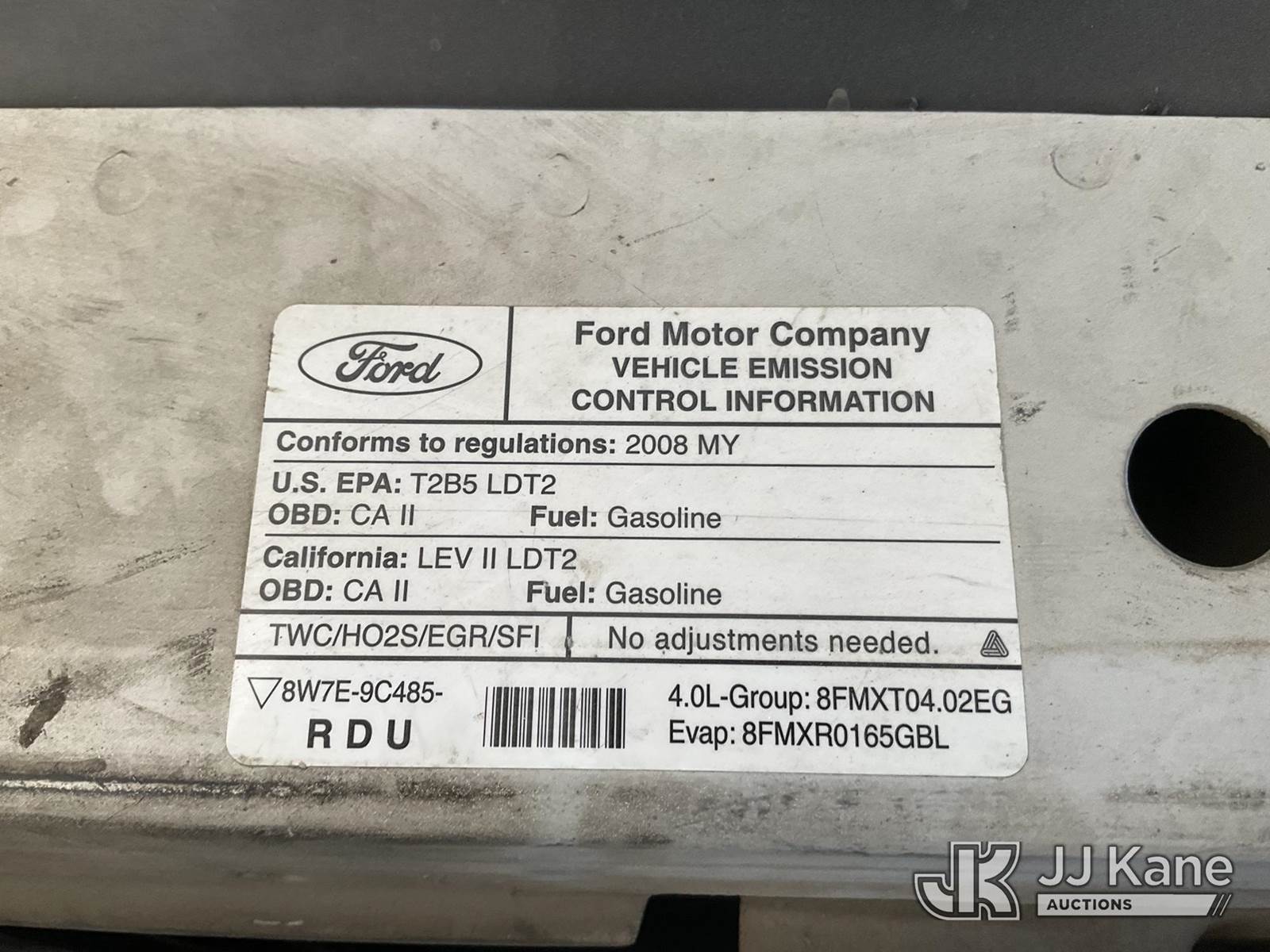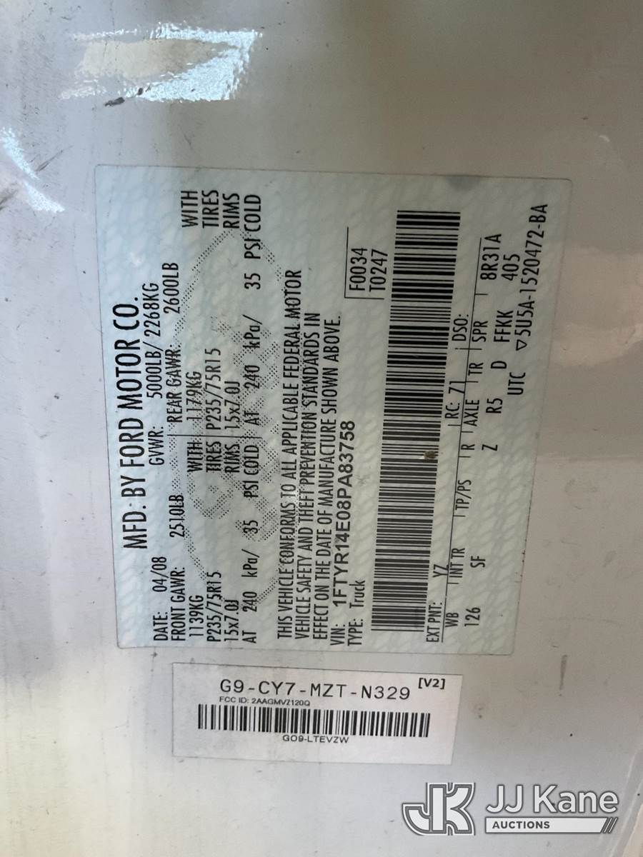 2008 Ford Ranger Extended-Cab Pickup Truck, s/n 1FTYR14E08PA83758, 4.0L V6 SOHC 12V Gas, RWD, 5-Speed Automatic, A/C, with 50 Gallon Water Tank, Toolbox, tow package, (70,301 miles) (Runs & Moves) This is a Titled Item NOTE: This unit is being sold AS IS/WHERE IS via Timed Auction and is located in Jurupa Valley, CA. Inspection & preview days for this unit are the 2 business days prior to the first day of items closing for this auction, item is located at 4510 Muth Way Jurupa Valley, CA 92509 and hours of operations are 8a-4p. For pre-sale questions, please contact please contact Office Staff @ (310) 353-7140. Dealer License Number 45696. (Buyer is responsible for removal. Assistance by consignor or JJ Kane Auctions is not assured.)