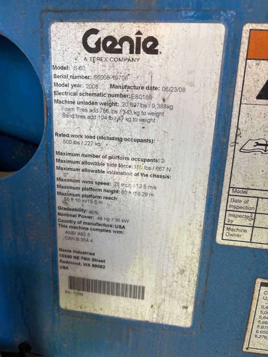 2008 Genie S60 Telescopic Boom Lift, 60 ft Max Platform Height, 500 lb Max Weight Capacity, Power to Platform, 48HP Deutz Diesel, fully operational, fleet maintained records.
