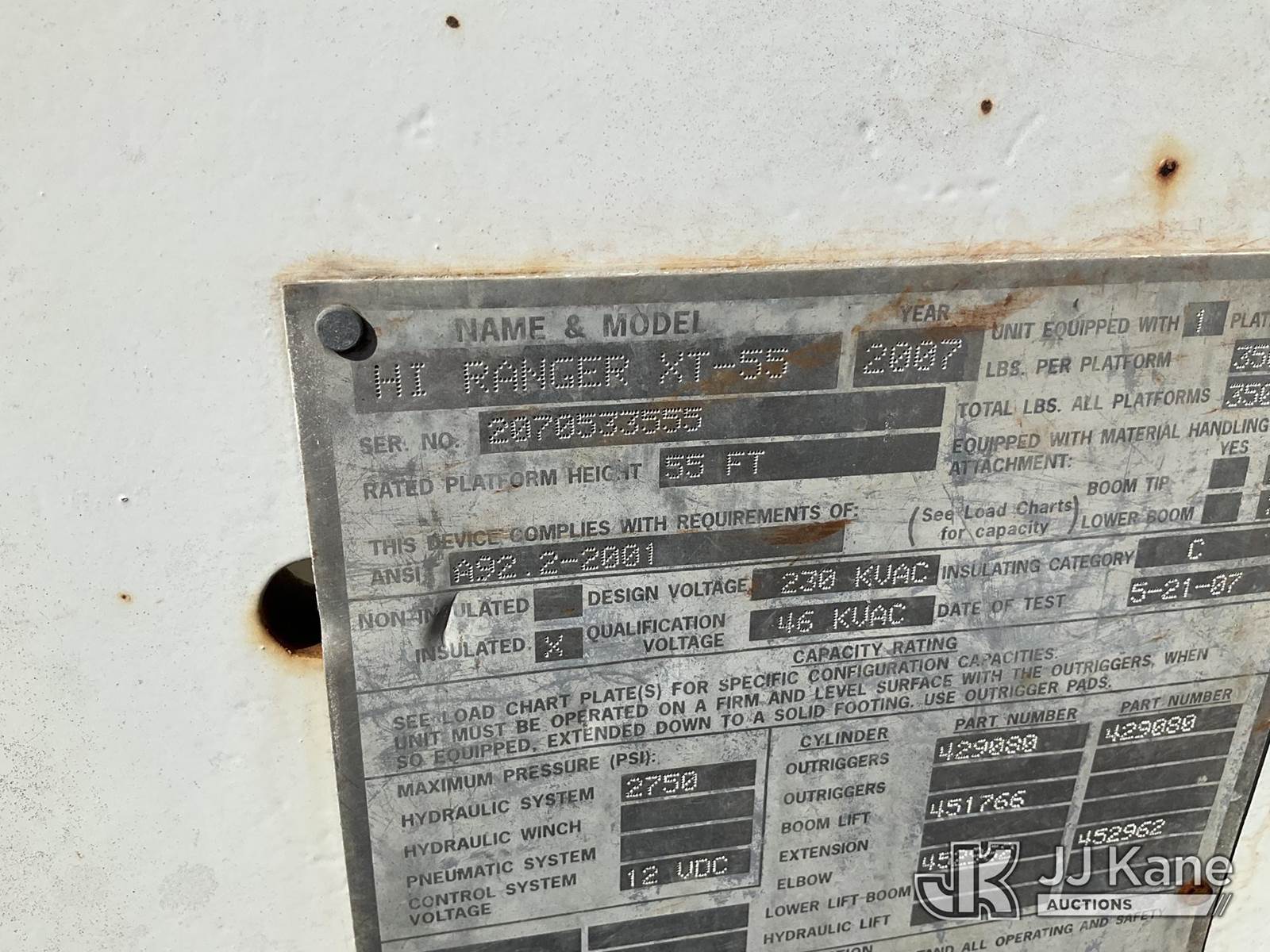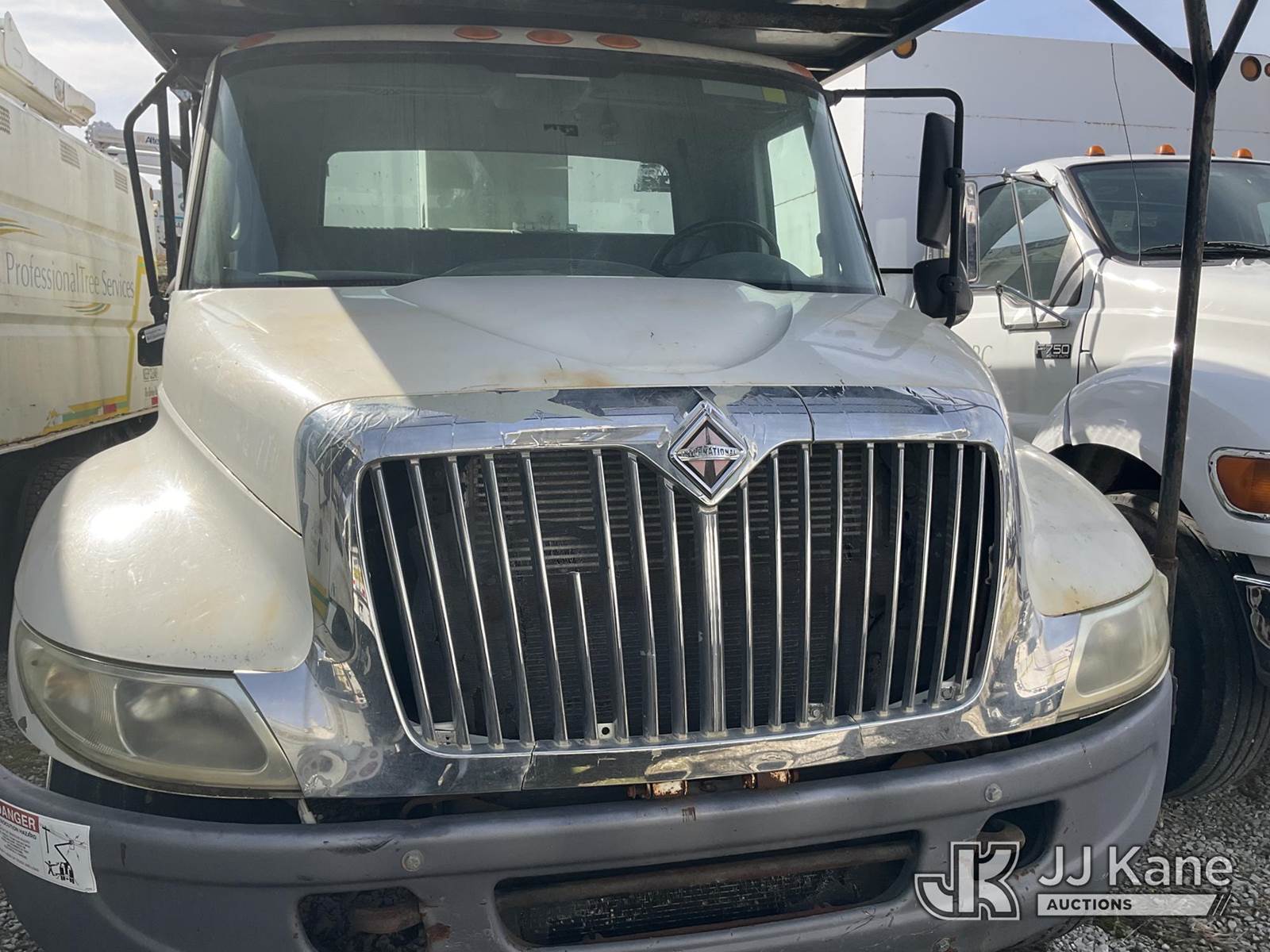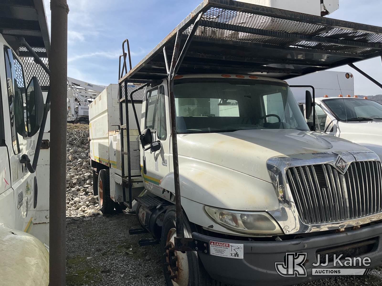HiRanger XT55, 60 ft, Over-Center Bucket Truck s/n 2070533555, with single man bucket, mounted behind cab on 2008 International 4300 Chipper Dump Truck, 7.6L diesel, 4X2, manual, True Mileage Unknown (Not Running, Condition Unknown) This is a Titled Item NOTE: This unit is being sold AS IS/WHERE IS via Timed Auction and is located in Jacksboro, TN. For more information & removal arrangements please contact Charlie de Kanter @ (281) 910-7147. (Missing manuals, See Auction Company for Manufacturers Information to obtain manuals) (Buyer is responsible for removal. Assistance by consignor or JJ Kane Auctions is not assured.)