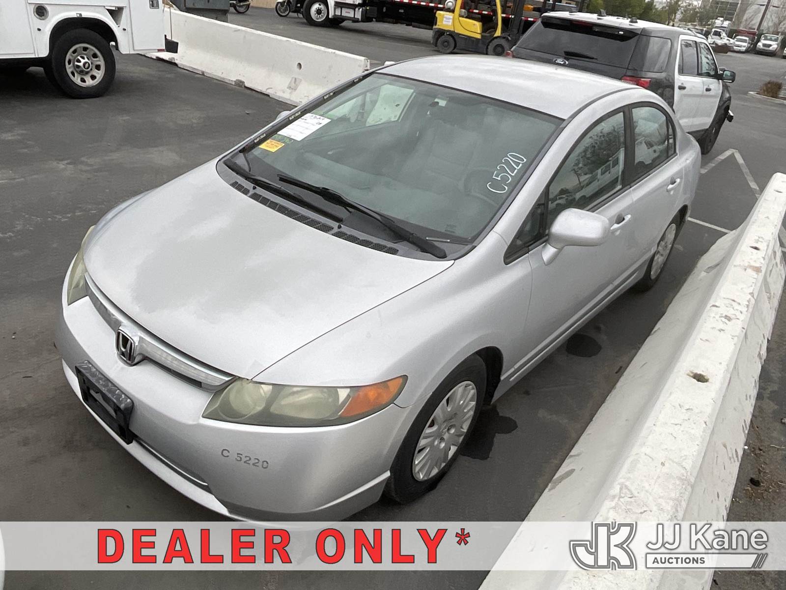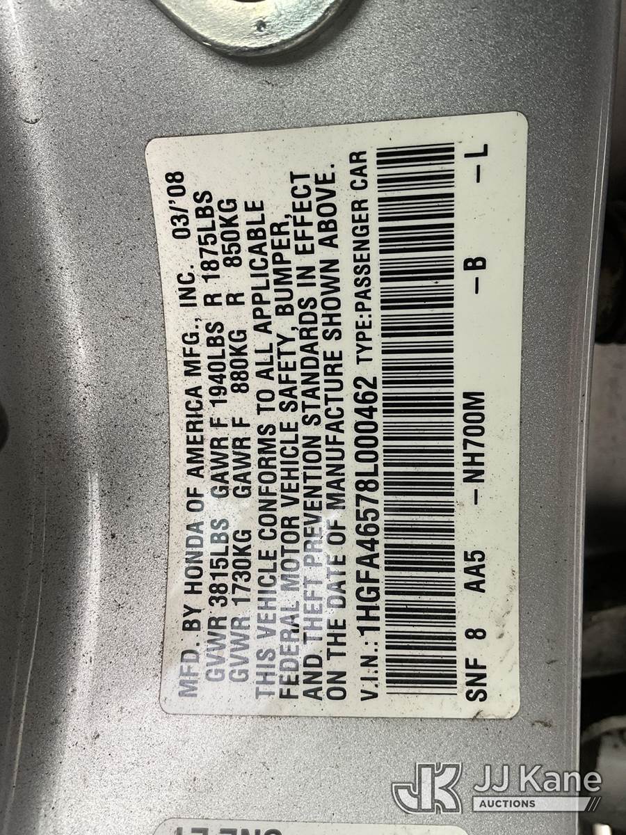 2008 Honda Civic 4-Door Sedan, s/n 1HGFA46578L000462, 4-cyl, CNG FWD, 5-Speed Automatic, A/C, (097,665 miles) (Runs, Does Not Move) (Transmission Slipping, No Emissions Sticker) (Bidding Restricted to Licensed Vehicle Dealers Only), This is a Titled Item NOTE: This unit is being sold AS IS/WHERE IS via Timed Auction and is located in Jurupa Valley, CA. Inspection & preview days for this unit are the 2 business days prior to the first day of items closing for this auction, item is located at 4510 Muth Way Jurupa Valley, CA 92509 and hours of operations are 8a-4p. For pre-sale questions, please contact please contact Office Staff @ (310) 353-7140. Dealer License Number 45696. (Buyer is responsible for removal. Assistance by consignor or JJ Kane Auctions is not assured.)
