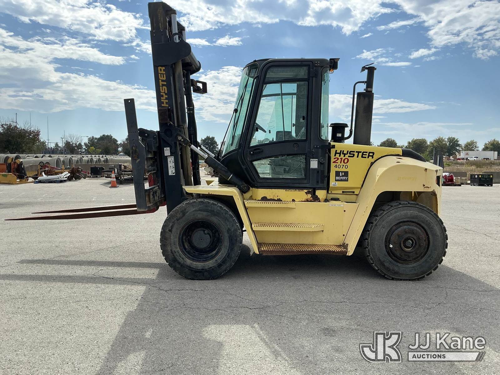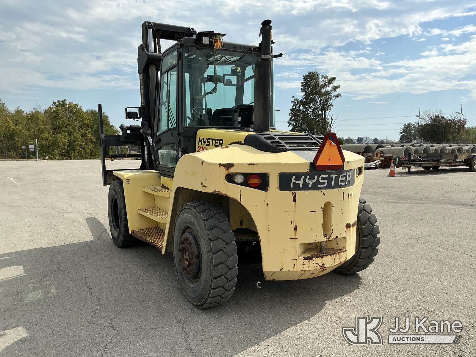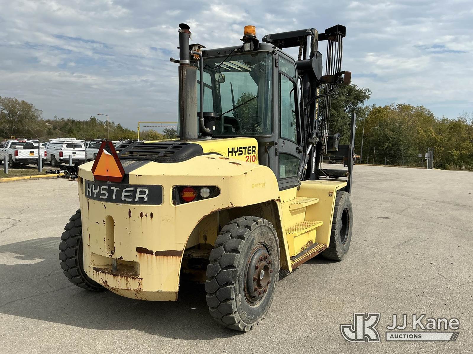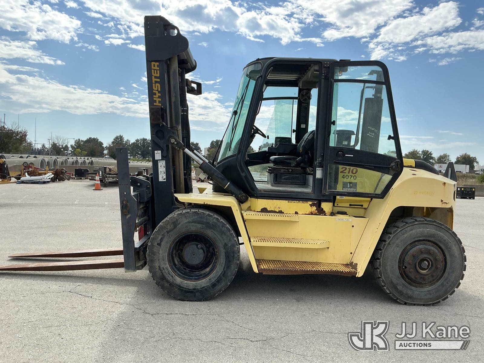 2008 Hyster H210HD Pneumatic Tired Forklift, s/n H007E01929F, Cummins Shuttle, diesel, A/C, with EROPS, Pneumatic Tires, Hydraulic Side Shift, Hydraulic Fork Positioning, 18750lb Capacity, 83in Forks, 212in 2 Stage Mast, (Runs, Moves & Operates ( Front Wiper Does Not Shut Off/ Rust & Paint Damage ) (Reads 1,570 hours) NOTE: This unit is being sold AS IS/WHERE IS via Timed Auction and is located in Kansas City, MO. Inspection & preview days for this unit are the 2 business days prior to the first day of items closing for this auction, item is located at 962 Tel Aviv Ave Kansas City, MO 64153 and hours of operations are 8a-4p. For pre-sale questions, please contact Ricky McPherson @ (816) 610-2250. (Buyer is responsible for removal. Assistance by consignor or JJ Kane Auctioneers is not assured.)