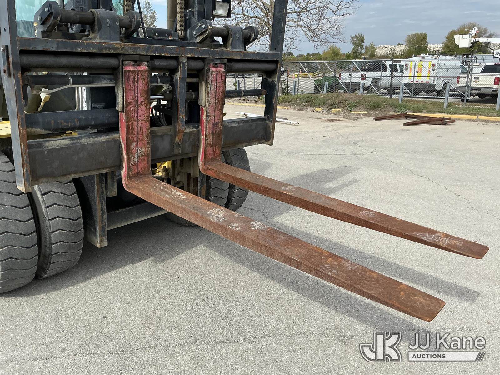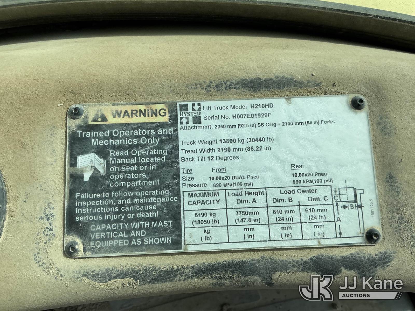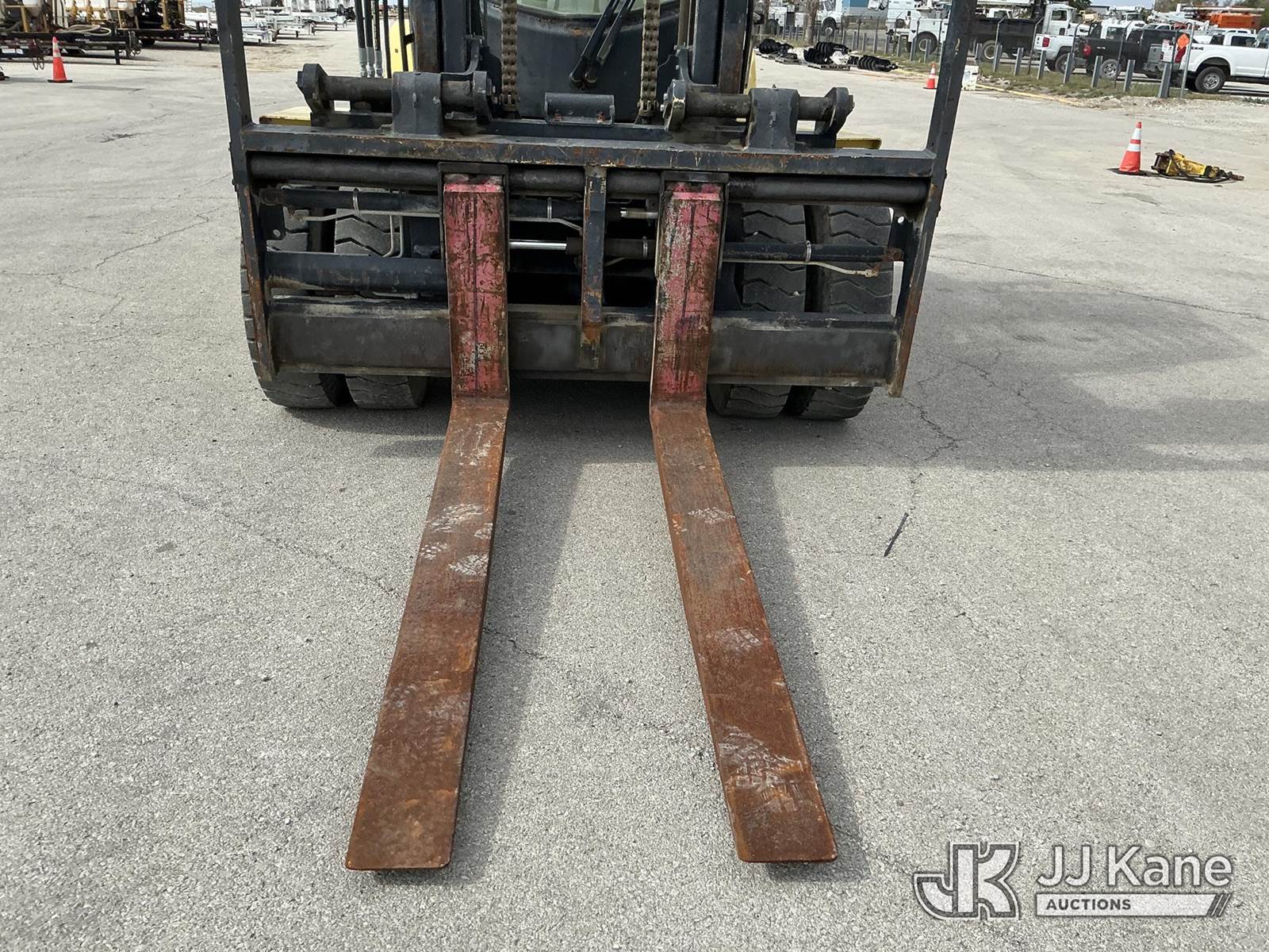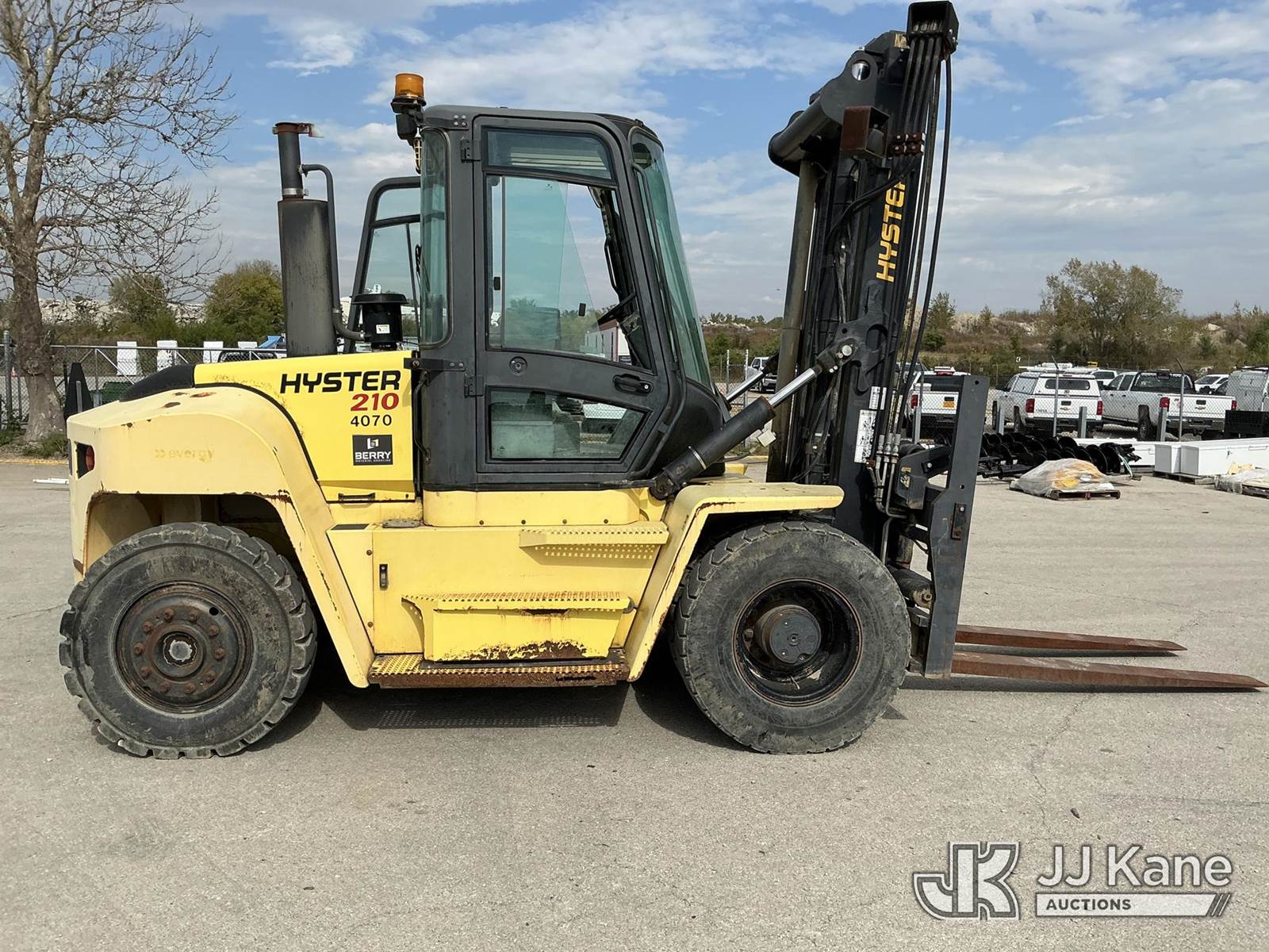 2008 Hyster H210HD Pneumatic Tired Forklift, s/n H007E01929F, Cummins Shuttle, diesel, A/C, with EROPS, Pneumatic Tires, Hydraulic Side Shift, Hydraulic Fork Positioning, 18750lb Capacity, 83in Forks, 212in 2 Stage Mast, (Runs, Moves & Operates ( Front Wiper Does Not Shut Off/ Rust & Paint Damage ) (Reads 1,570 hours) NOTE: This unit is being sold AS IS/WHERE IS via Timed Auction and is located in Kansas City, MO. Inspection & preview days for this unit are the 2 business days prior to the first day of items closing for this auction, item is located at 962 Tel Aviv Ave Kansas City, MO 64153 and hours of operations are 8a-4p. For pre-sale questions, please contact Ricky McPherson @ (816) 610-2250. (Buyer is responsible for removal. Assistance by consignor or JJ Kane Auctioneers is not assured.)
