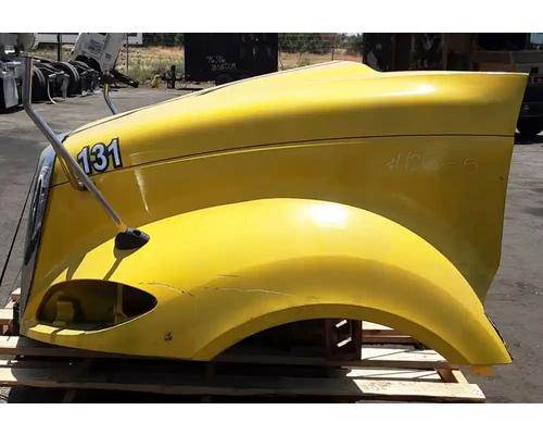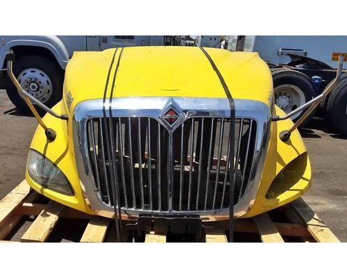 2008 International ProStar Hood, 56"L, Set Back Axle. P/N 3595962C91, 3611066C95, 3858544C92. Missing Left Headlight, Repair Work Visible On Inside, Scrapes On Left Fender, Lower Area of Grille Cracked