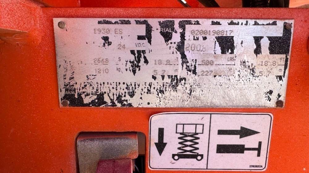 2008 JLG 1930ES SCISSORLIFT, electric, 19' lift, extendable platform, 657 hours indicated. s/n:0200190817
