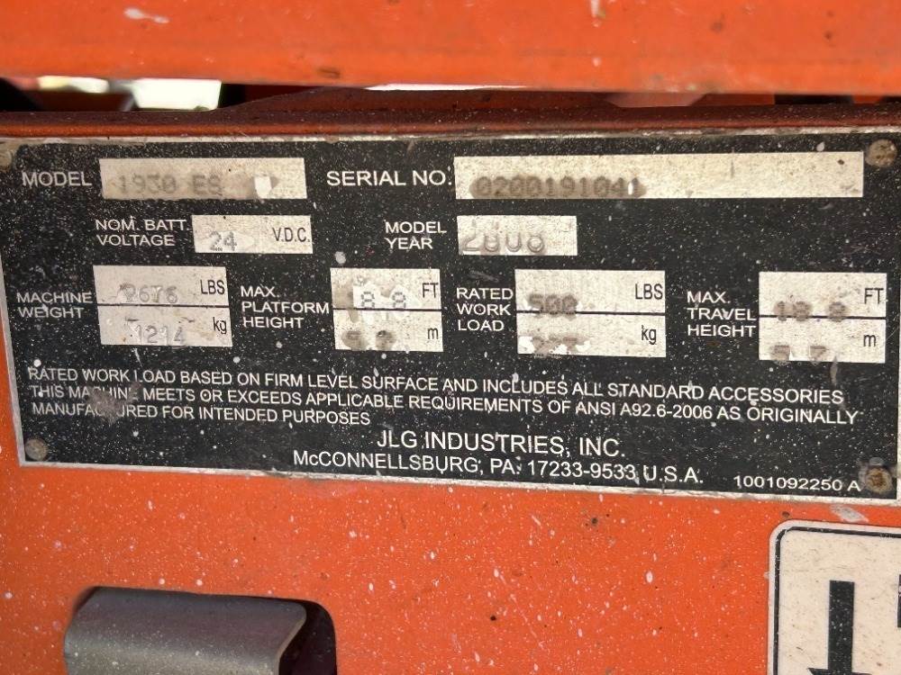 2008 JLG 1930ES SCISSORLIFT, electric, 19' lift, extendable platform, 914 hours indicated. s/n:0200191041