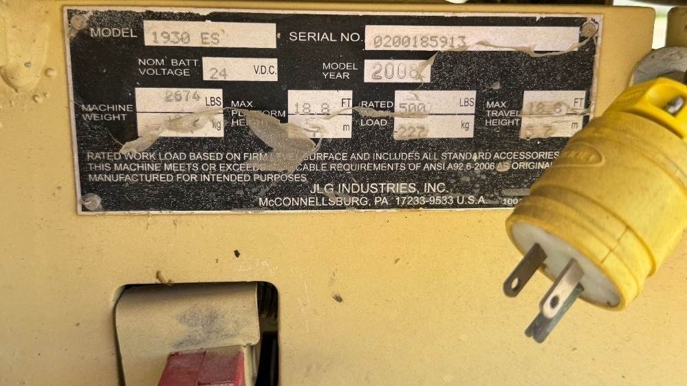 2008 JLG 1930ES SCISSORLIFT, electric, 19' lift, extendable platform, 572 hours indicated. s/n:0200185913