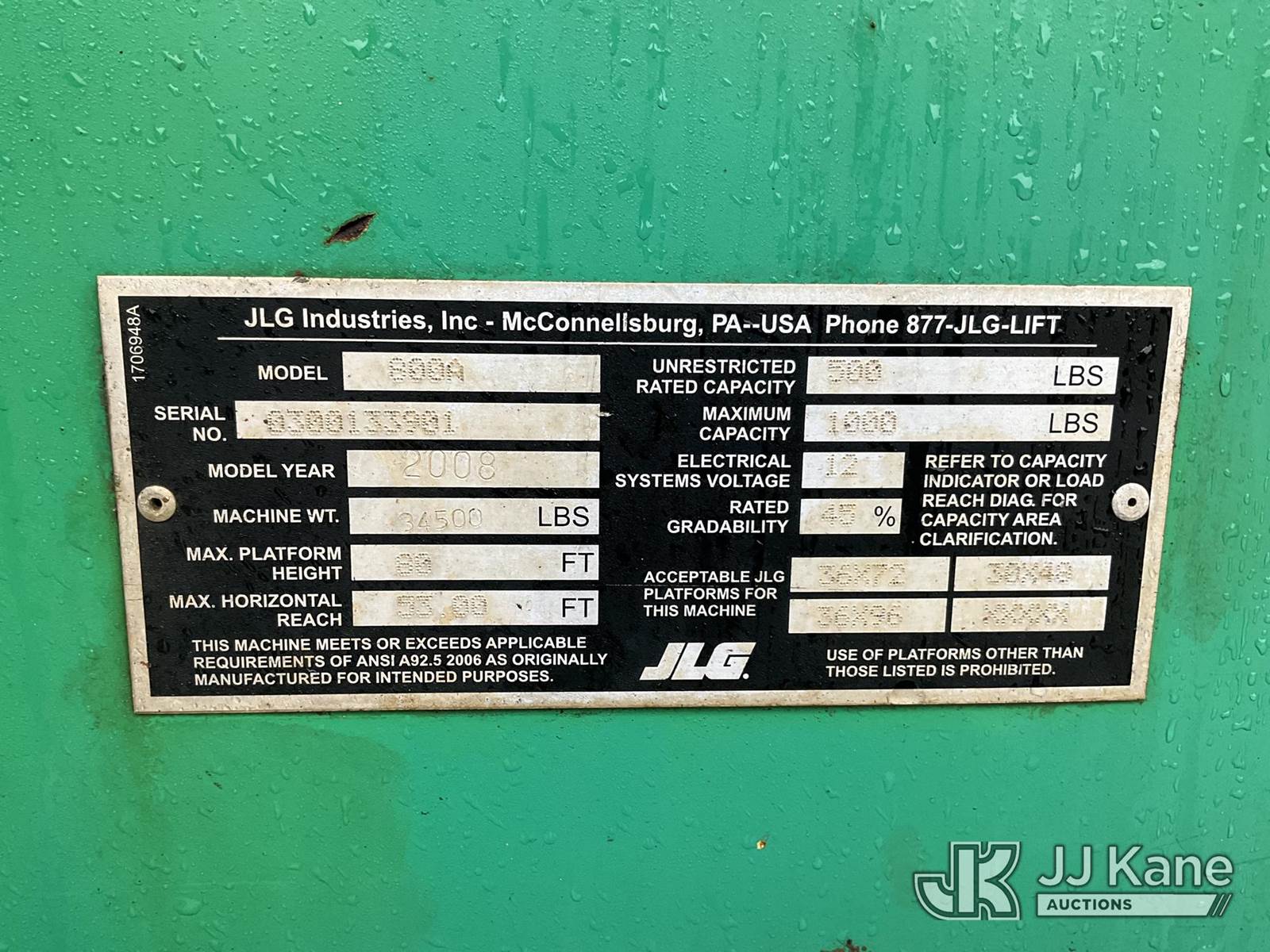 2008 JLG 800A 4x4 Telescopic Boom Lift, s/n 0300133901, Deutz Hydraulic Driven, diesel, with 80 ft. platform height, (Runs, Moves & Operates) (Reads 5,446 hours) NOTE: This unit is being sold AS IS/WHERE IS via Timed Auction and is located in Shrewsbury, MA. Inspection & preview days for this unit are the 2 business days prior to the first day of items closing for this auction, item is located at 11 Fortune Blvd Shrewsbury, MA 01545 and hours of operations are 8a-4p. For pre-sale questions, please contact Rob Gifford @ (508) 864-4126. (Buyer is responsible for removal. Assistance by consignor or JJ Kane Auctioneers is not assured.)