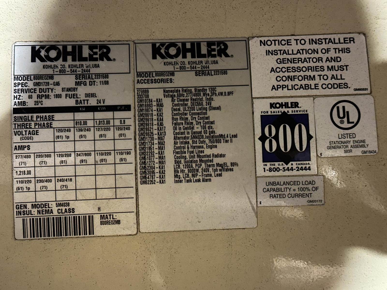 2008 Kohler 800 KW Diesel Generator