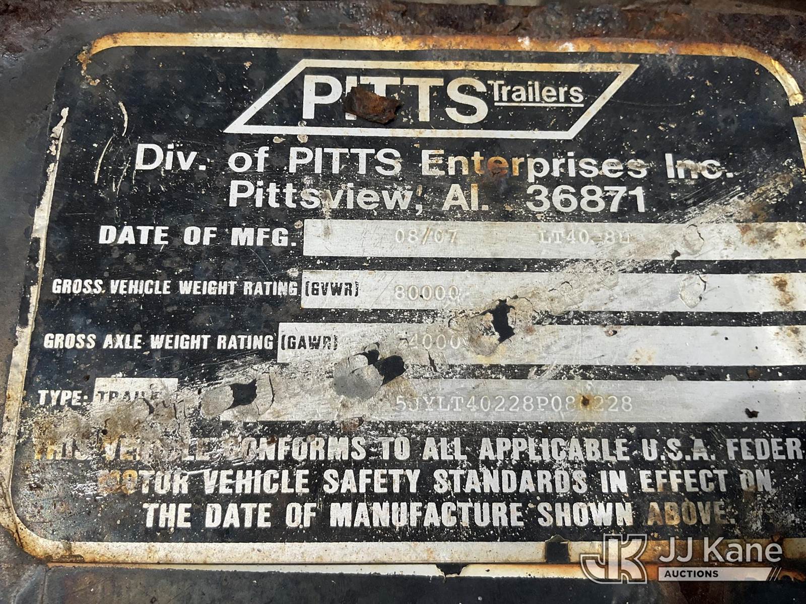 2008 Pitts T/A Log Trailer, s/n 5JYLT40228P080228, with GVWR: 80,000 LB, (NO TITLE) (Special Mobile Equipment - Bill of Sale Only) NOTE: This unit is being sold AS IS/WHERE IS via Timed Auction and is located in Shrewsbury, MA. Inspection & preview days for this unit are the 2 business days prior to the first day of items closing for this auction, item is located at 11 Fortune Blvd Shrewsbury, MA 01545 and hours of operations are 8a-4p. For pre-sale questions, please contact Rob Gifford @ (508) 864-4126. (Buyer is responsible for removal. Assistance by consignor or JJ Kane Auctioneers is not assured.)