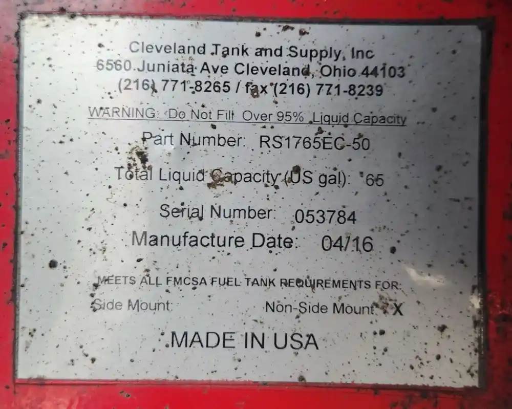 (Used) 2008 Seagrave Pumpers, FUEL TANK- Part Number: RS1765EC-50, Serial Number: 053784, Side: Rear, Capacity: 65 Gallons, Material: Steel, Shape: Rectangular, Dimensions: L=33", H=17", W=27", For more information about this item, give us a call. We ship Worldwide! (CRG HEAVY TRUCK PARTS) 929 W PULASKI HWY ELKTON, MD 21921, Capacity: 65 Gallons, Dimensions: L=33", H=17", W=27", Material: Steel, Shape: Rectangular