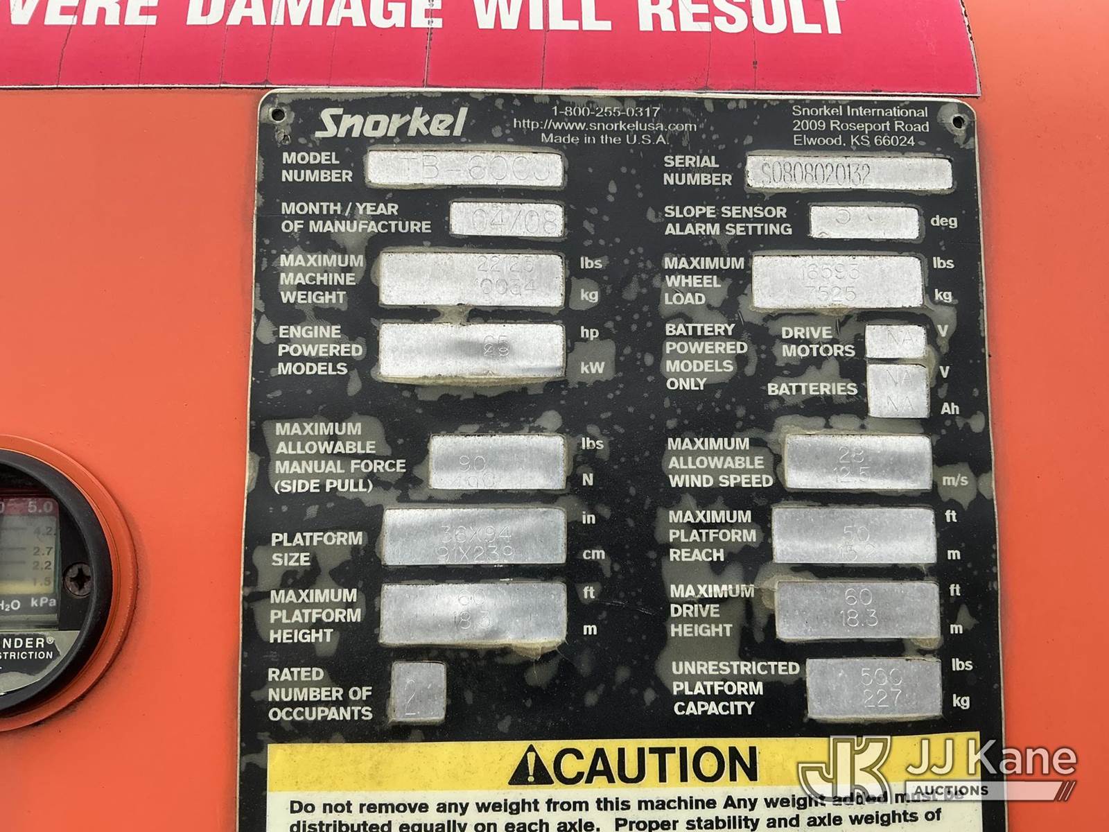 2008 Snorkel TB60 Self-Propelled Telescopic Manlift, s/n S0808020132, Cummins diesel, Hydraulic Driven, with 60 ft. max platform height, (Runs, Moves & Operates) (Reads 4,087 hours) NOTE: This unit is being sold AS IS/WHERE IS via Timed Auction and is located in Shrewsbury, MA. Inspection & preview days for this unit are the 2 business days prior to the first day of items closing for this auction, item is located at 11 Fortune Blvd Shrewsbury, MA 01545 and hours of operations are 8a-4p. For pre-sale questions, please contact Rob Gifford @ (508) 864-4126. (Buyer is responsible for removal. Assistance by consignor or JJ Kane Auctions is not assured.)