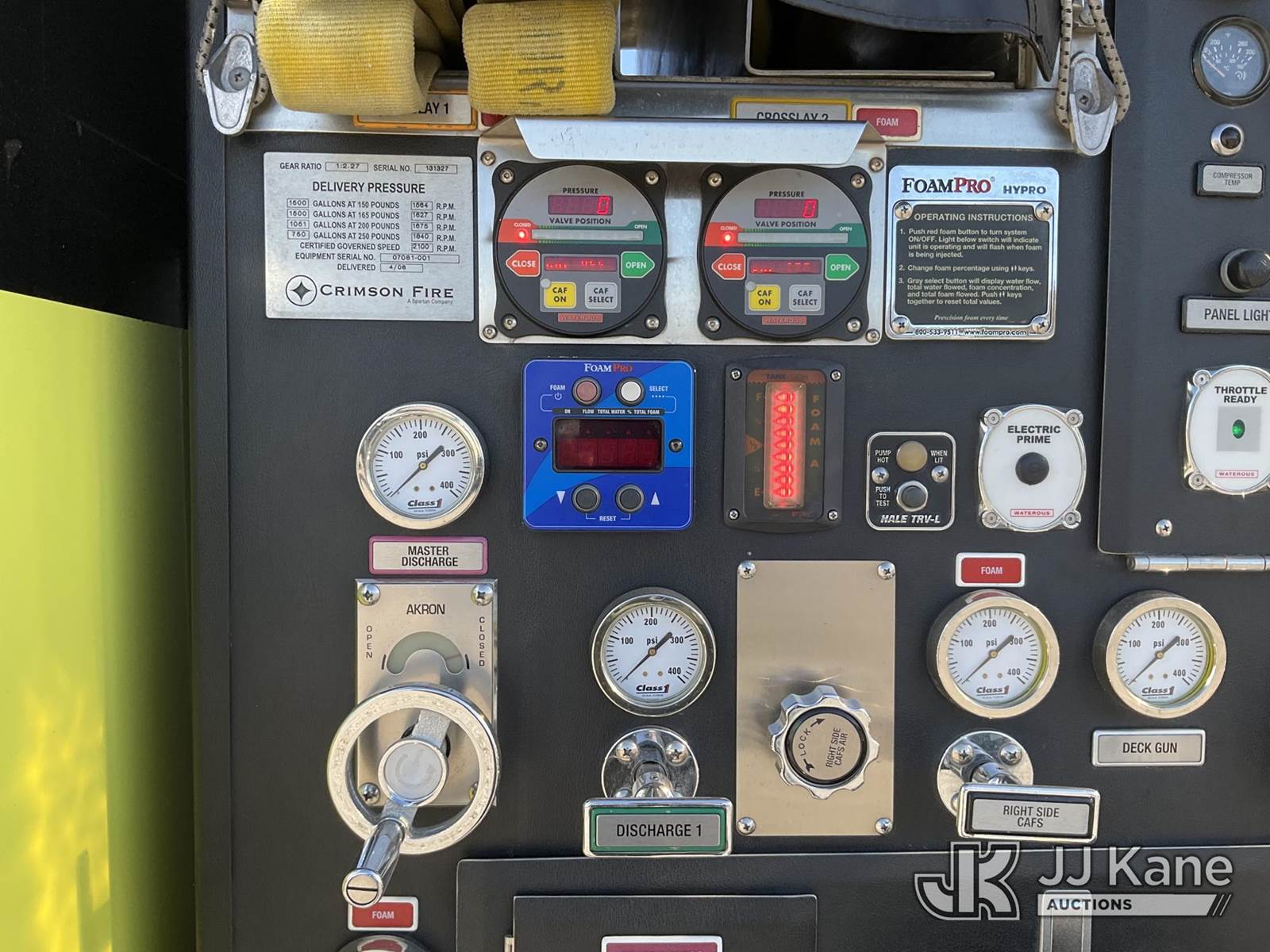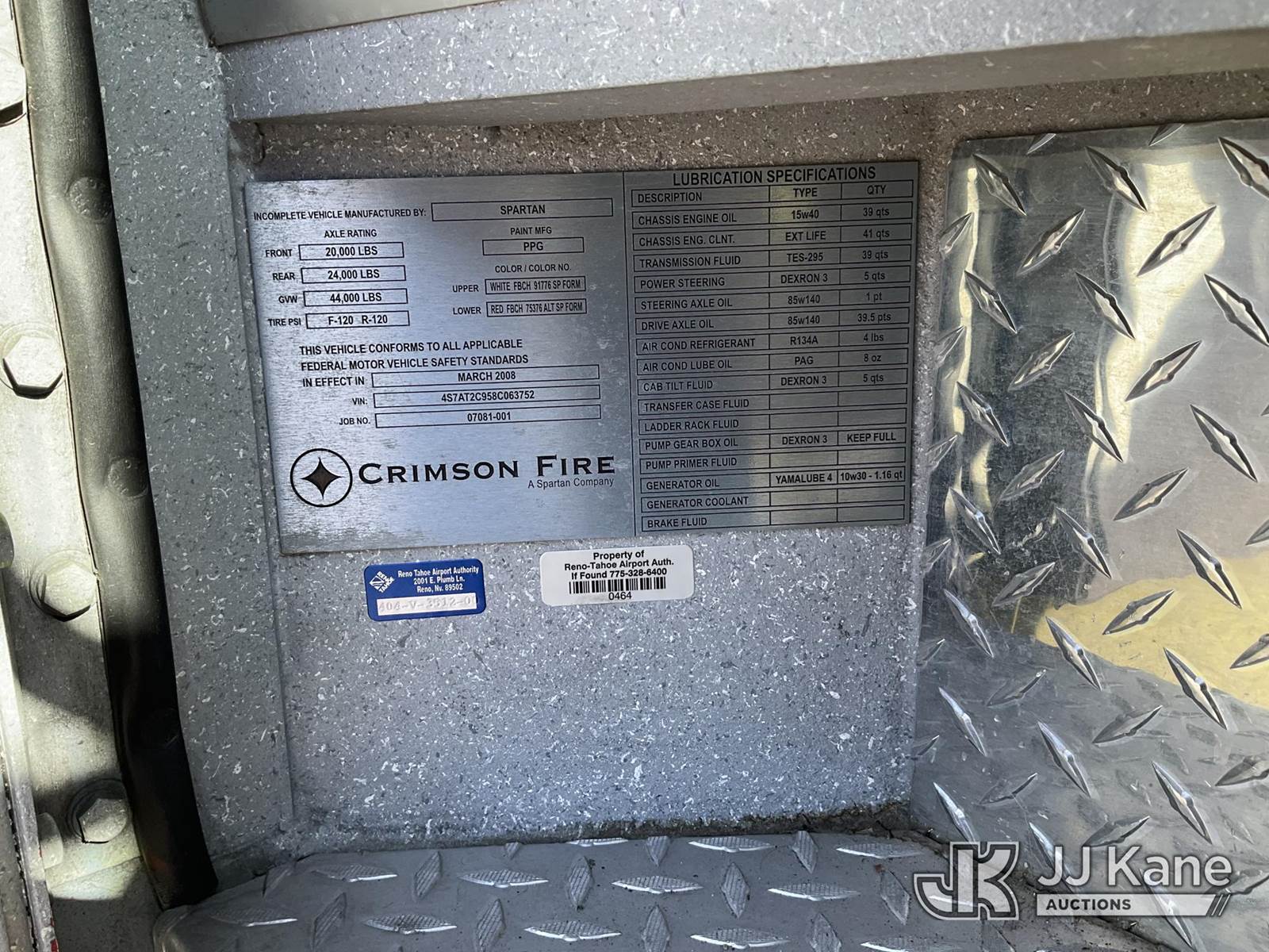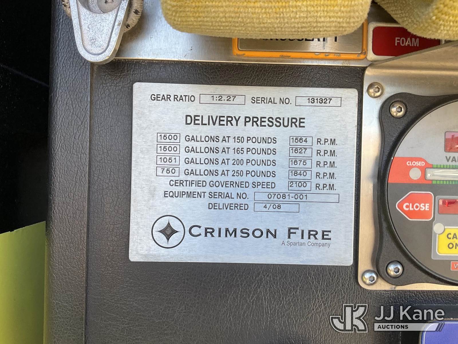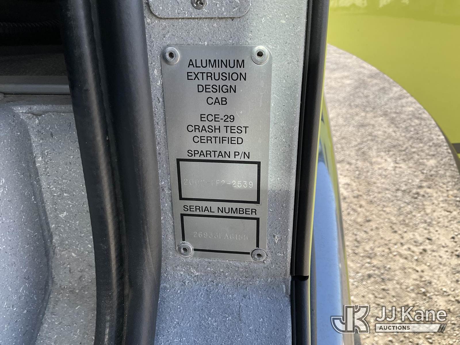 2008 Spartan Gladiator Fire Truck, Cummins 10.8L 6 Cylinder 4x2, diesel, Auto, A/C, (101,178 miles) (Runs, Moves & Operates) (Reads 8,021 hours) This is a Titled Item NOTE: This unit is being sold AS IS/WHERE IS via Timed Auction and is located in Sparks, NV. Inspection & preview days for this unit are the 2 business days prior to the first day of items closing for this auction, item is located at 601 Britain Dr Sparks, NV 89437 and hours of operations are 8a-4p. Titles executed exactly as bidder registered. Ensure your name and/or business name and address in JJ Kane and/or ProxiBid is correct before bidding. For pre-sale questions, please contact Office Staff @ (801) 519-0123 and provide sale date and lot number. Sparks Dealer License Number DLR000052908 / OHV000052909. (Buyer is responsible for removal. Assistance by consignor or JJ Kane Auctions is not assured.)