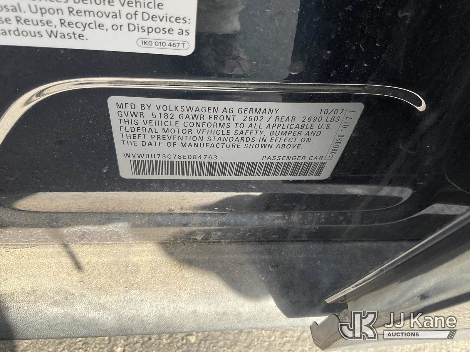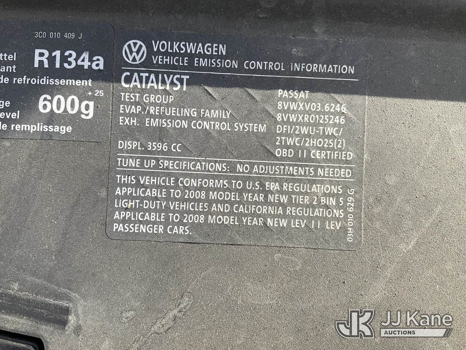 2008 Volkswagen Passat Wagon 4-Door Station Wagon, s/n WVWRU73C78E084763, 3.6L V6 DOHC 24V Gas, AWD, 6-Speed Automatic, A/C, (10,476 miles) (Runs & Moves) This is a Titled Item NOTE: This unit is being sold AS IS/WHERE IS via Timed Auction and is located in Jurupa Valley, CA. Inspection & preview days for this unit are the 2 business days prior to the first day of items closing for this auction, item is located at 4510 Muth Way Jurupa Valley, CA 92509 and hours of operations are 8a-4p. For pre-sale questions, please contact please contact Office Staff @ (310) 353-7140. Dealer License Number 45696. (Buyer is responsible for removal. Assistance by consignor or JJ Kane Auctions is not assured.)