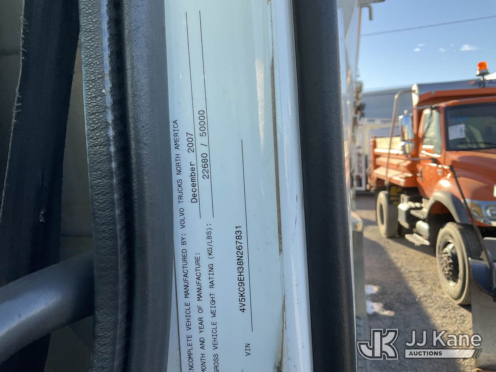 2008 Volvo VHD Dump Truck, s/n 4V5KC9EH38N267831, 12.8L L6 DIESEL 6X4, 18 spd, with Tow Package, Aluminum Wheels , (177,164 miles) To Be Sold With Item# 1582842 (Runs, Moves & Operates) (Missing Battery Cover) Subject to CARB Regs,CARB non Compliant,Cannot Operate on CA Roads/Highways until Compliant This is a Titled Item NOTE: This unit is being sold AS IS/WHERE IS via Timed Auction and is located in Jurupa Valley, CA. Inspection & preview days for this unit are the 2 business days prior to the first day of items closing for this auction, item is located at 4510 Muth Way Jurupa Valley, CA 92509 and hours of operations are 8a-4p. For pre-sale questions, please contact please contact Office Staff @ (310) 353-7140. Dealer License Number 45696. (Buyer is responsible for removal. Assistance by consignor or JJ Kane Auctions is not assured.)