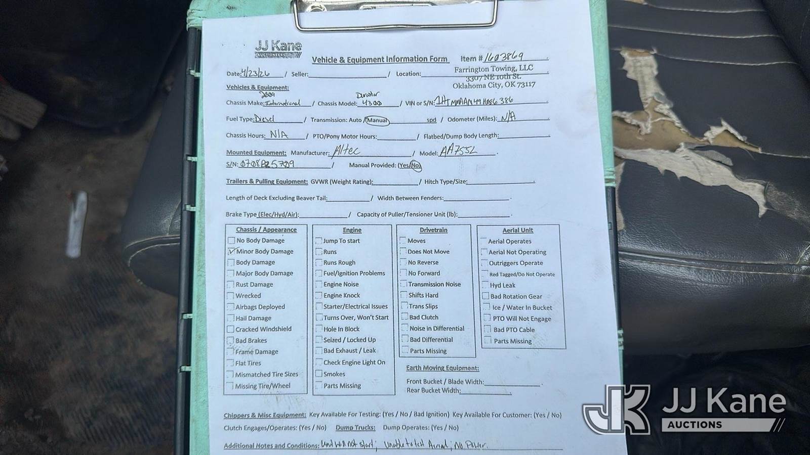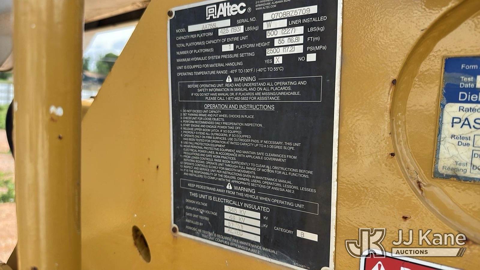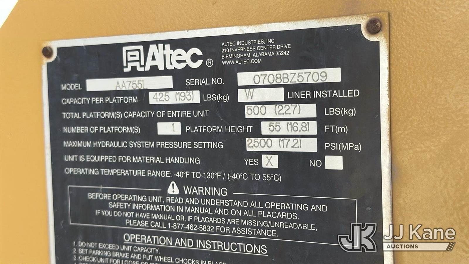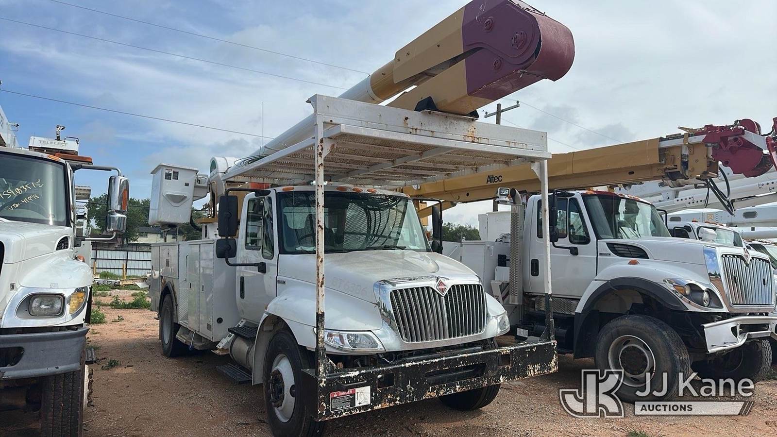 Altec AA755L, 60 ft, Bucket s/n 0708BZ5709, with two man bucket, rear mounted on 2009 International 4300 Utility Truck, 7.6L 4X2, Diesel, Manual, A/C, True Mileage Unknown ((Not Running, Condition Unknown, Corrosion)) This is a Titled Item NOTE: This unit is being sold AS IS/WHERE IS via Timed Auction and is located in Oklahoma City, OK. Inspection & preview days for this unit are by appointment only; please contact us at contact@jjkane.com or 84-Go-JJKane for more details. (Missing manuals, See Auction Company for Manufacturers Information to obtain manuals) (Buyer is responsible for removal. Assistance by consignor or JJ Kane Auctions is not assured.)