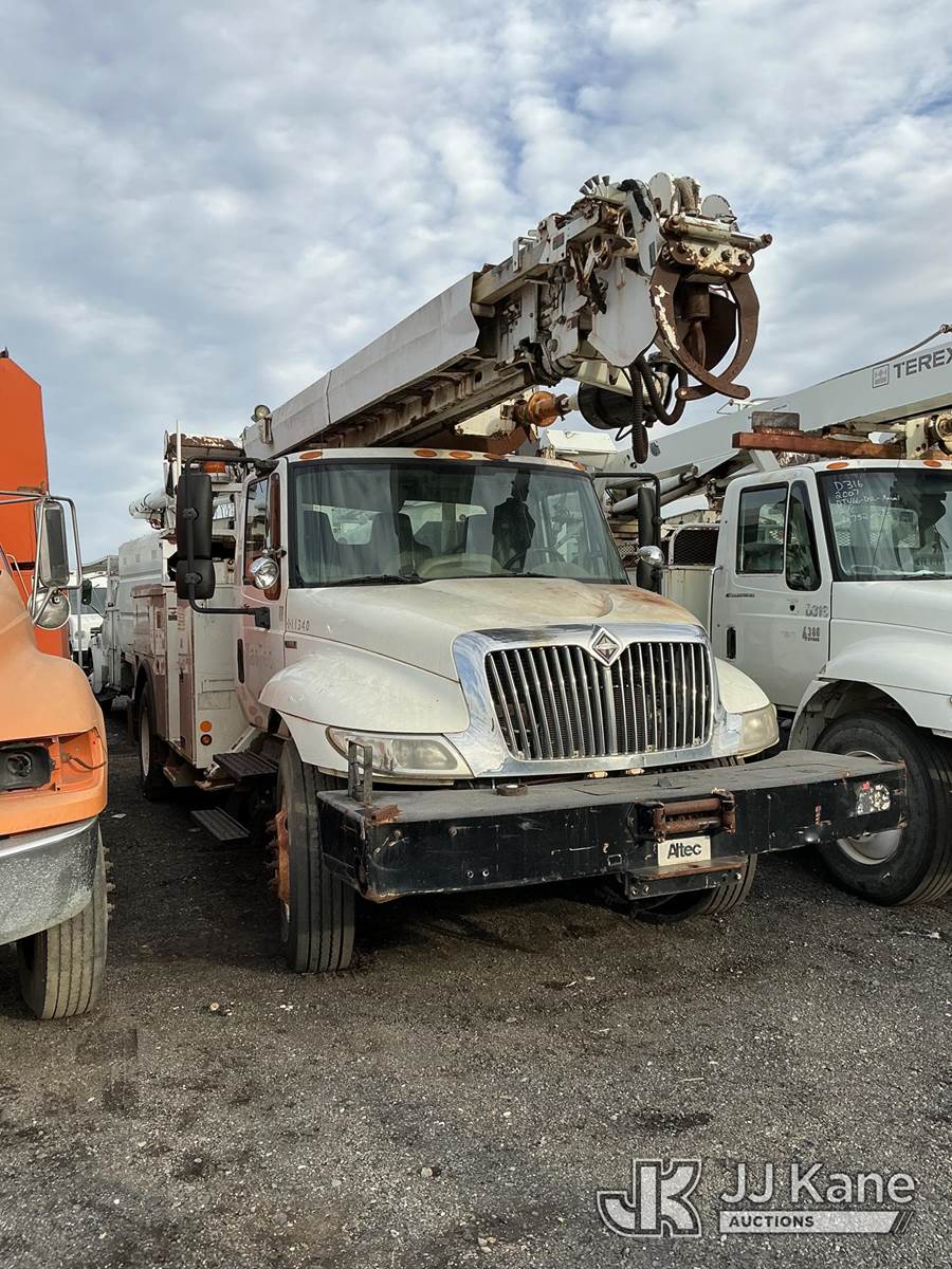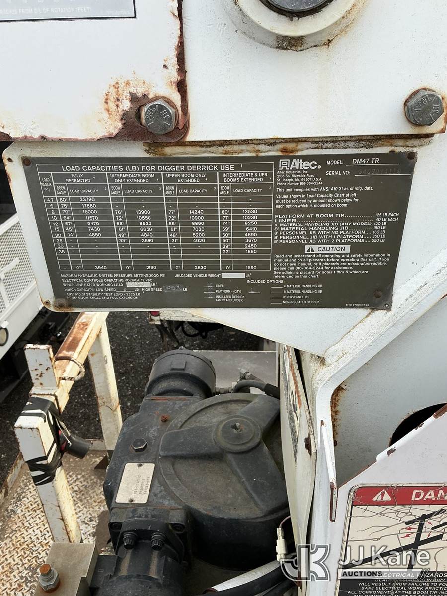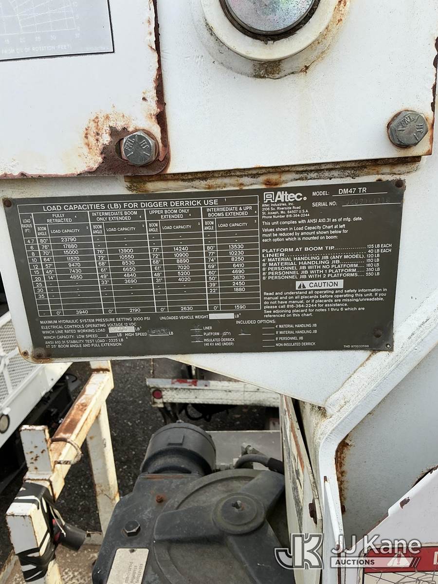 Altec DM47TR, 23,790 Lb Digger Derrick s/n 0409DV4118, with 47 ft. sheave height, 3 section hyd boom, 2 spd digger, upper controls, heel winch, pole guides, riding console & 4 hyd outriggers, rear mounted on 2009 International 4300 Utility Truck, Maxxforce DT diesel, 4X2, Auto, A/C, with front winch, True Mileage Unknown (Not Running, Condition Unknown, Upper Condition Unknown, Rust/Body Damage) This is a Titled Item NOTE: This unit is being sold AS IS/WHERE IS via Timed Auction and is located in Pennsville, NJ. For pre-sale questions and pickups, please contact Pete Rhodes at peter.rhodes@jjkane.com. Pickups can be conducted Monday through Friday 9:30am to 3:00pm. (Missing manuals, See Auction Company for Manufacturers Information to obtain manuals) (Buyer is responsible for removal. Assistance by consignor or JJ Kane Auctions is not assured.)