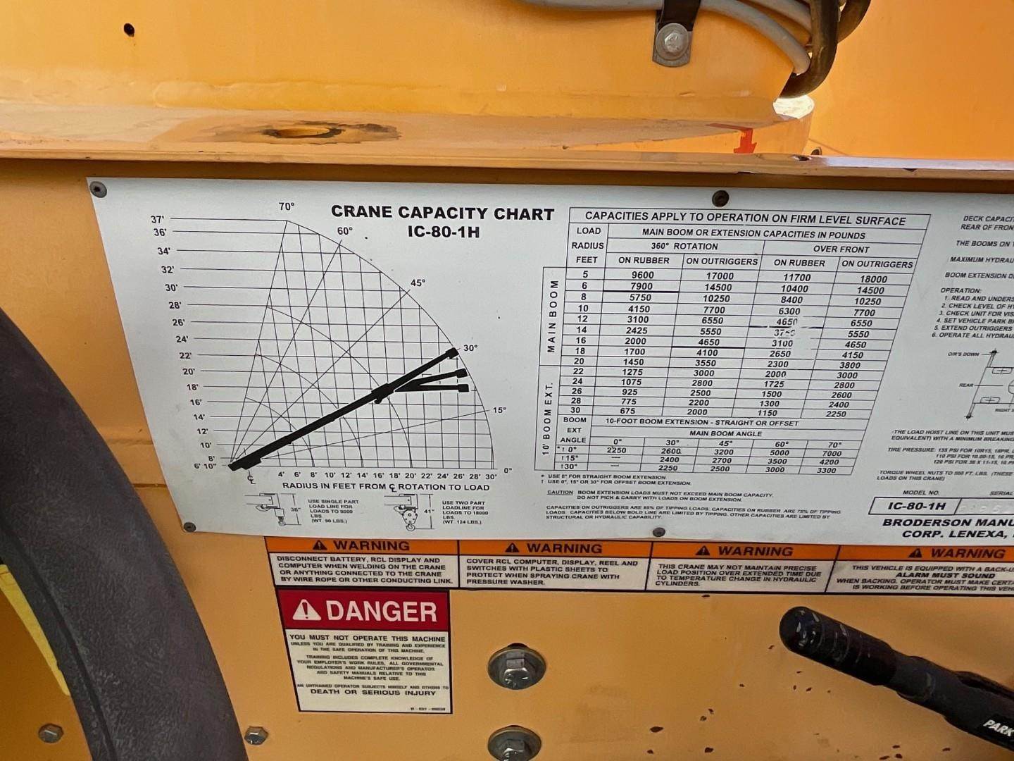 2009 Broderson IC-80-1H 9 Ton Deck Crane, Cummins 3.3L Diesel, Powershift Transmission, 4 Forward and 4 Reverse Gears, 4 Hydraulic Outriggers, 9 Ton Capacity, 30′ Boom Length, 10 Ton Sheave Block, Greer LMI, Ex-Utility Company, Hour Meter Reading 144 Hours