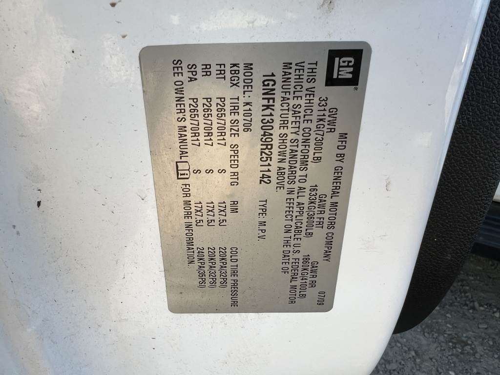 Location: Washougal WA ***End-User Consignment*** VIN: 1GNFK13049R251142 Engine: 5.3L 8cyl Gas Transmission: Automatic *Body damage* Roof rack w/cross bars, tow package, running boards, power windows, power mirrors, power locks, cruise control, A/C, AM/FM/CD, P225/70R17 tires. Miles: 214,321