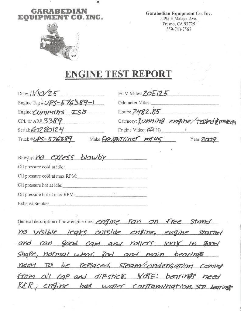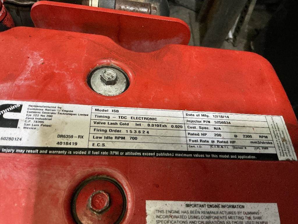 ISB 6.7L, CM2150, 200 HP, S/N 60280124, CPL 3389, DOM 2014. Engine sounds good. Rods & mains checked and should be replaced. Sold as running engine AS IS. (Please see video of engine running and test report)