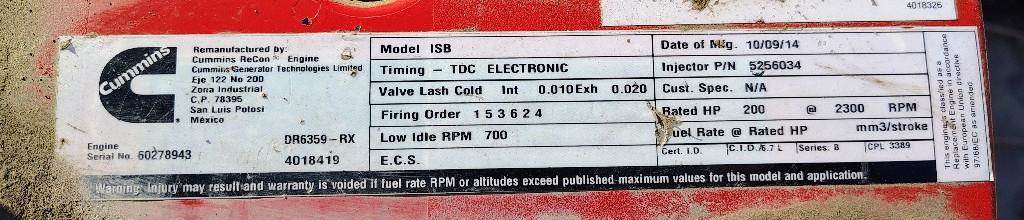 ISB, 6.7L, CM2150; 200 HP; S/N 60278943; CPL 3389; DOM 2014
