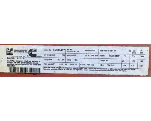 ISB, 6.7L, CM2150; 200 HP; S/N 46933497; CPL 3238; DOM 2008
