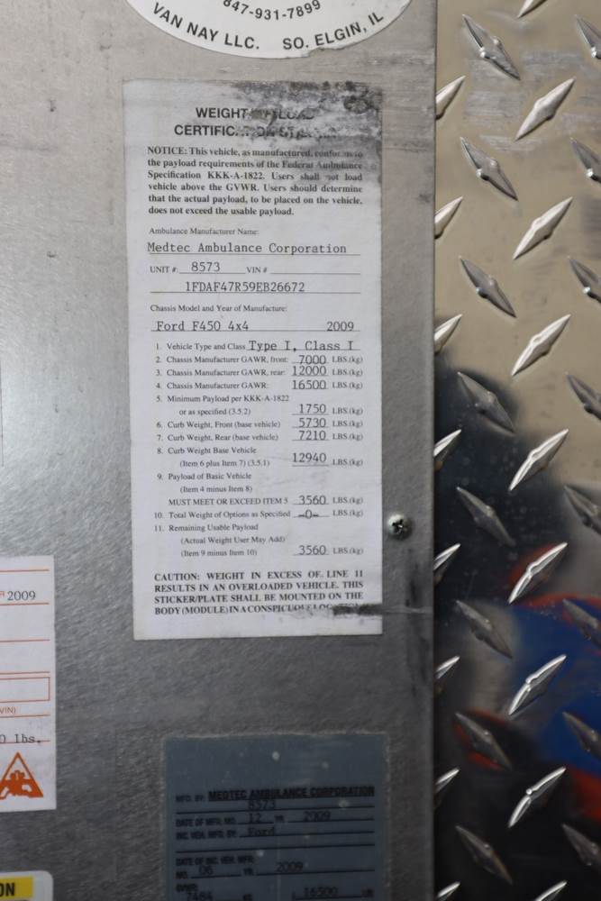 Item is a 2009 Ford F-450 Super Duty XLT 4x4 Type I Ambulance. Mfg. by Medtec Ambulance Corp. Item is located in Espous, NY. . All lots are subject to seller approval. Payment is due by Thursday, January 8 at 1PM. Address & contact for pickup will be given to winning bidders after seller approval. Pickup is by appointment only & must be completed by Tuesday, January 13 at 2PM. Please bring proper tools, assistance and transportation for removal of items. All lots sold as is, where is. There is a 10% Buyer's Premium & must be paid for in guaranteed funds: cash, cashier's check, money order or wire transfer. All lots are subject to seller approval. Preview available online 24/7. Live preview is also available by appointment. Email info@AARauctions.com to request preview contact information.