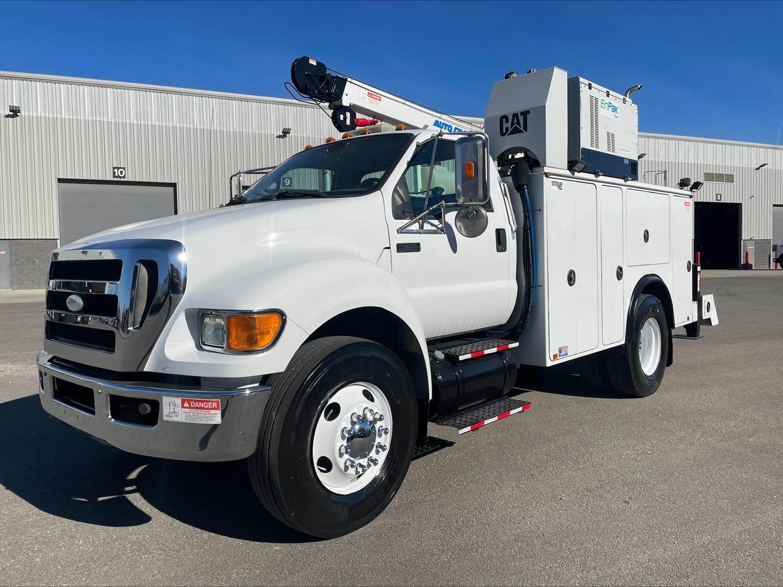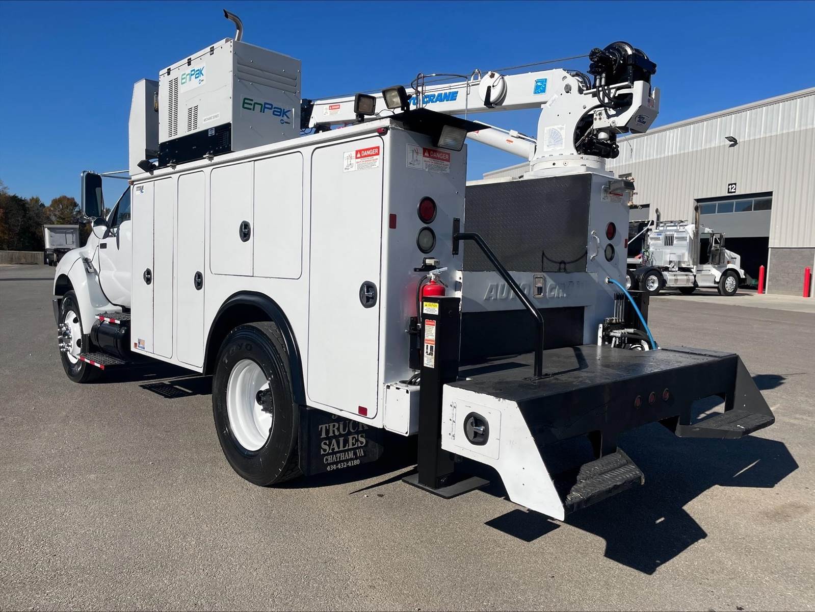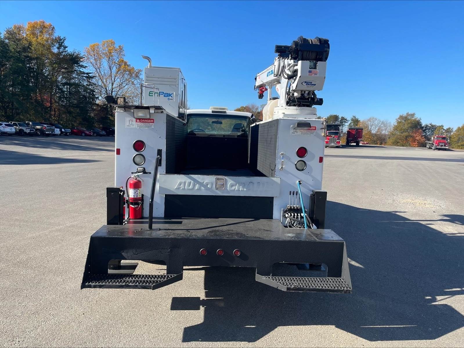 Single Axle, 11' AutoCrane Service Body, Miller-ENPAK with Kubota Diesel, AutoCrane 100006H Crane, (9) 28" Drawers, Hydraulic Outriggers, C7 Cat, 7 Speed, Spring Suspension, 10K FA, 21K RA, 158" WB, P/S, A/C, AM/FM CD, Cruise, Tilt Wheel, Power Windows and Locks, 11R22.5 Tires on Steel Wheels, Chrome Bumper