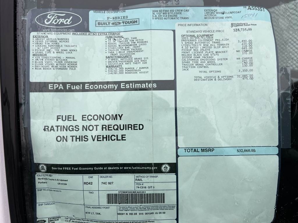 Location: Washougal WA ***County Government Surplus*** VIN: 1FDWW30539EA55351 Engine: 5.4L 8cyl Gas Transmission: Automatic ABC 8' x 6'4" flatbed, ladder rack, 2 storage compartments, tow package, running boards, 10,199 engine hours, A/C, AM/FM, spring suspension, LT265/70R17 tires. Miles: 132,657