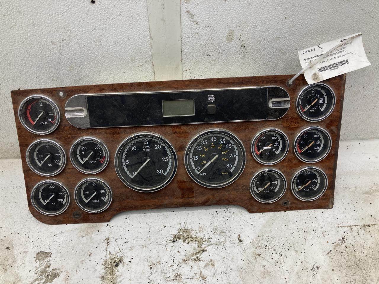 (USED) Freightliner CASCADIA Gauges: 12 Engine: DETROIT DD15 Part#: VERIFY VOLTS, OIL TEMP, WATER PSI, OIL TEMP, TURBO MANIFOLD PSI, RPM, MPH, FUEL, AIR PSI X2, FRONT DRIVE AXLE TEMP, REAR DRIVE AXLE TEMP