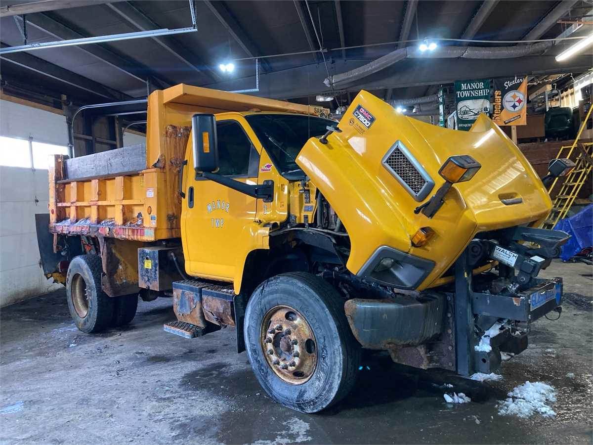 2009 GMC C7500 Series Dump Truck. Sold as is. Truck runs good. Truck and chassis are in good condition but the dump bed is rusted and has some holes and will most likely need replaced. Would make a good construction or farm truck. Original mileage is 53,716 with a gasoline engine. Hydraulic system works well and has attachment for a plow but the plow isn't included. A spreader box is included.