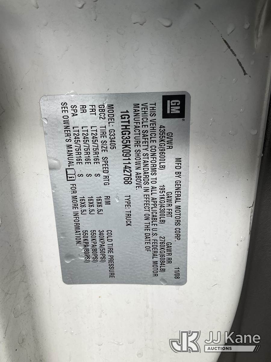 2009 GMC Savana G3500 Cargo Van, 6.0L V8 OHV 16V Gas, RWD, 4-Speed Automatic, A/C, (22,193 miles) (Runs & Moves) This is a Titled Item NOTE: This unit is being sold AS IS/WHERE IS via Timed Auction and is located in Jurupa Valley, CA. Inspection & preview days for this unit are the 2 business days prior to the first day of items closing for this auction, item is located at 4510 Muth Way Jurupa Valley, CA 92509 and hours of operations are 8a-4p. For pre-sale questions, please contact please contact Office Staff @ (310) 353-7140. Dealer License Number 45696. (Buyer is responsible for removal. Assistance by consignor or JJ Kane Auctions is not assured.)
