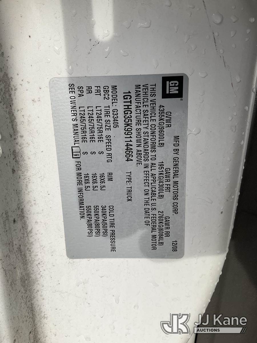 2009 GMC Savana G3500 Cargo Van, 8-cyl gas, 4-Speed Automatic, A/C, (148,051 miles) (Runs & Moves) (Paint Damage) This is a Titled Item NOTE: This unit is being sold AS IS/WHERE IS via Timed Auction and is located in Jurupa Valley, CA. Inspection & preview days for this unit are the 2 business days prior to the first day of items closing for this auction, item is located at 4510 Muth Way Jurupa Valley, CA 92509 and hours of operations are 8a-4p. For pre-sale questions, please contact please contact Office Staff @ (310) 353-7140. Dealer License Number 45696. (Buyer is responsible for removal. Assistance by consignor or JJ Kane Auctions is not assured.)