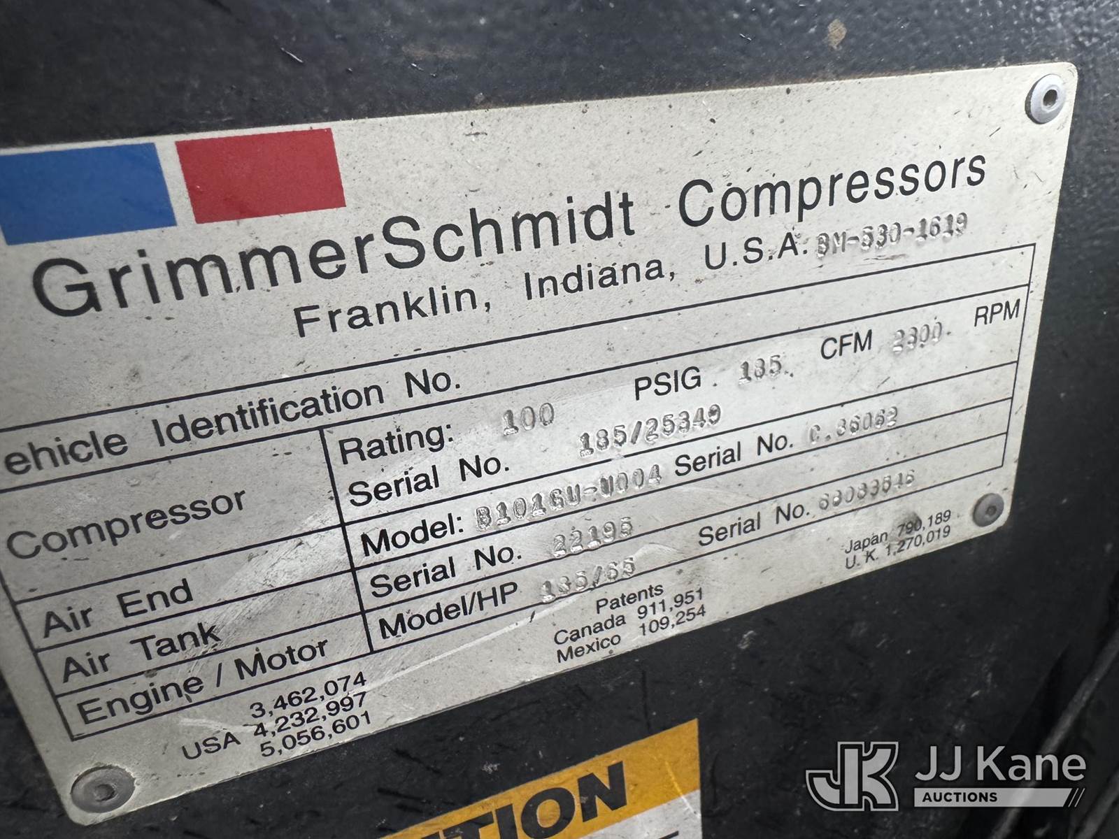 2009 Grimmer Schmidt 185D Portable Air Compressor, s/n 25349, Cummins B3.3 diesel, trailer mtd (No Title) (Runs & Makes Air) (Reads 2,831 hours) NOTE: This unit is being sold AS IS/WHERE IS via Timed Auction and is located in Shrewsbury, MA. Inspection & preview days for this unit are the 2 business days prior to the first day of items closing for this auction, item is located at 11 Fortune Blvd Shrewsbury, MA 01545 and hours of operations are 8a-4p. For pre-sale questions, please contact Rob Gifford @ (508) 864-4126. (Buyer is responsible for removal. Assistance by consignor or JJ Kane Auctions is not assured.)