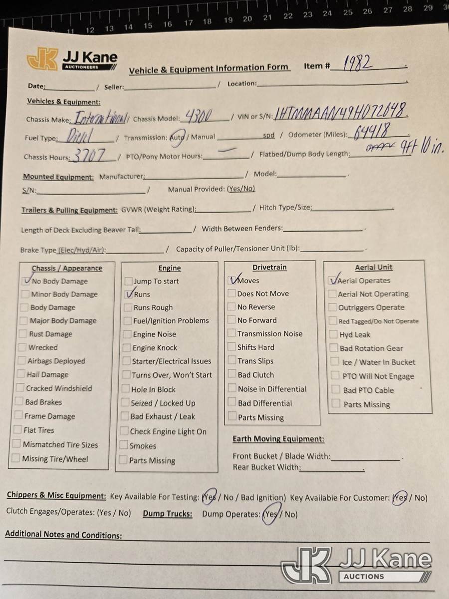2009 International 4300 Dump Truck, 7.6L L6 DIESEL 4X2, Auto, A/C, (64,418 miles) (Runs, Moves, Dump Operates) (Reads 3,707 hours) This is a Titled Item NOTE: This unit is being sold AS IS/WHERE IS via Timed Auction and is located in Oshkosh, WI. Inspection & preview days for this unit are by appointment only; please contact us at contact@jjkane.com or 84-Go-JJKane for more details. (Buyer is responsible for removal. Assistance by consignor or JJ Kane Auctions is not assured.)
