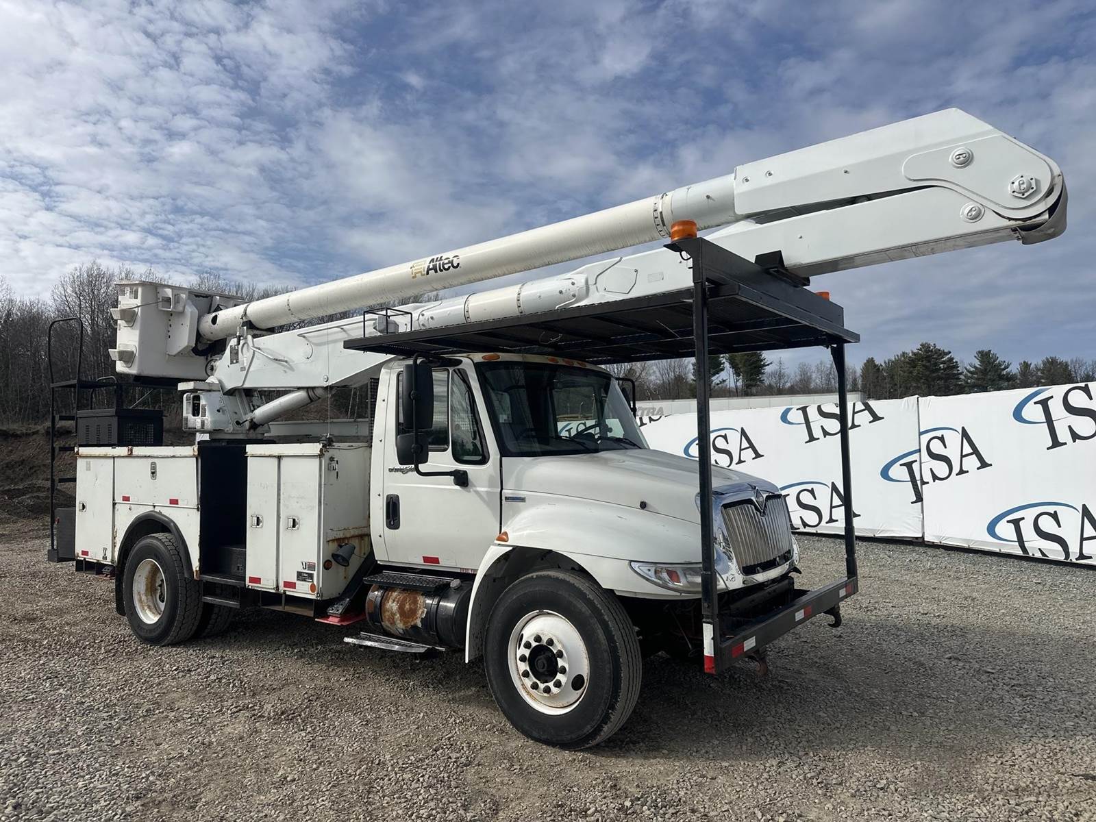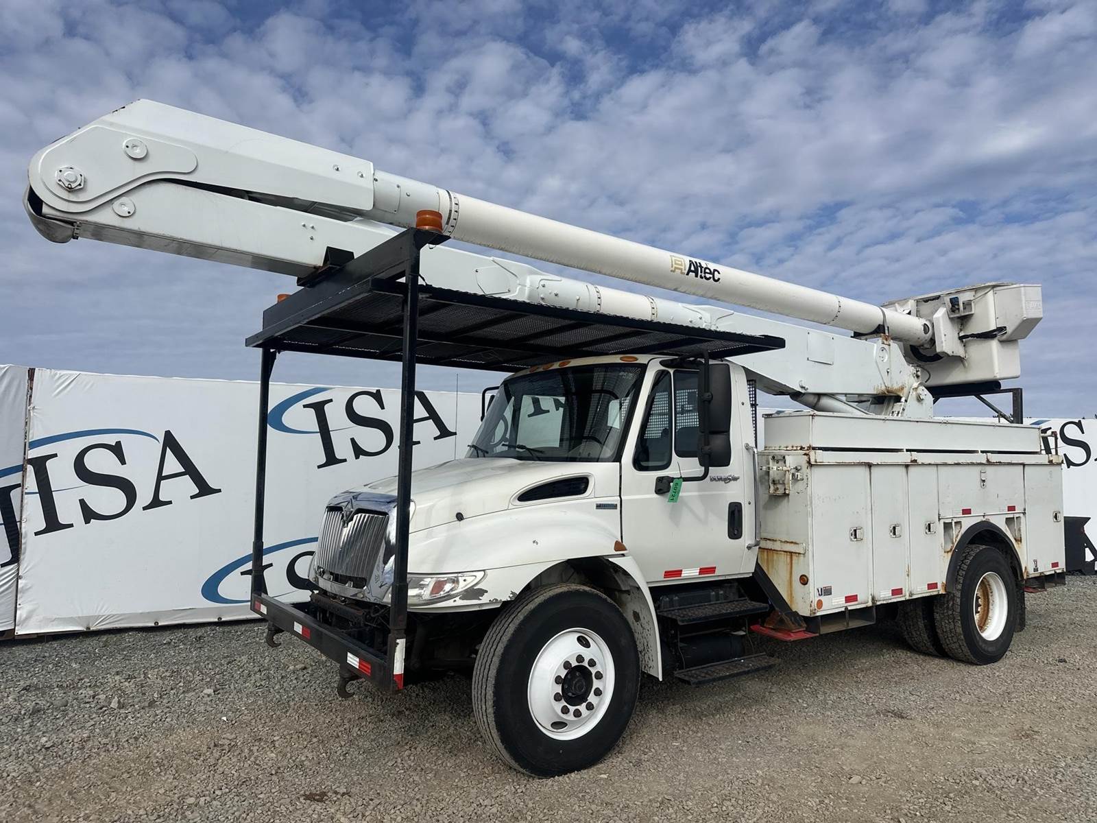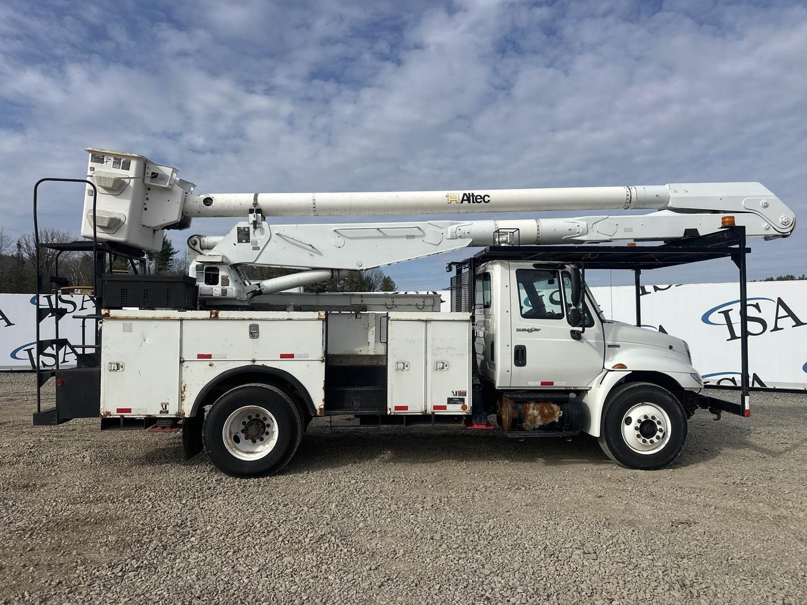 MaxxForce DT255 Turbo Diesel Engine, International 6 PLUS Manual Transmission, GVWR: 33000LB, 13000LB Front Axle, Spring Ride, Differential Lock, PTO, (9) Door Service Body, Approx 15' Service Body Length, (4) Outriggers, Altec AA755L Lift, 700LB Platform Capacity, Approx 56' Max Platform Height, Upper and Lower Controls, Heat, A/C, Radio, Cruise Control, 11R22.5 Tires