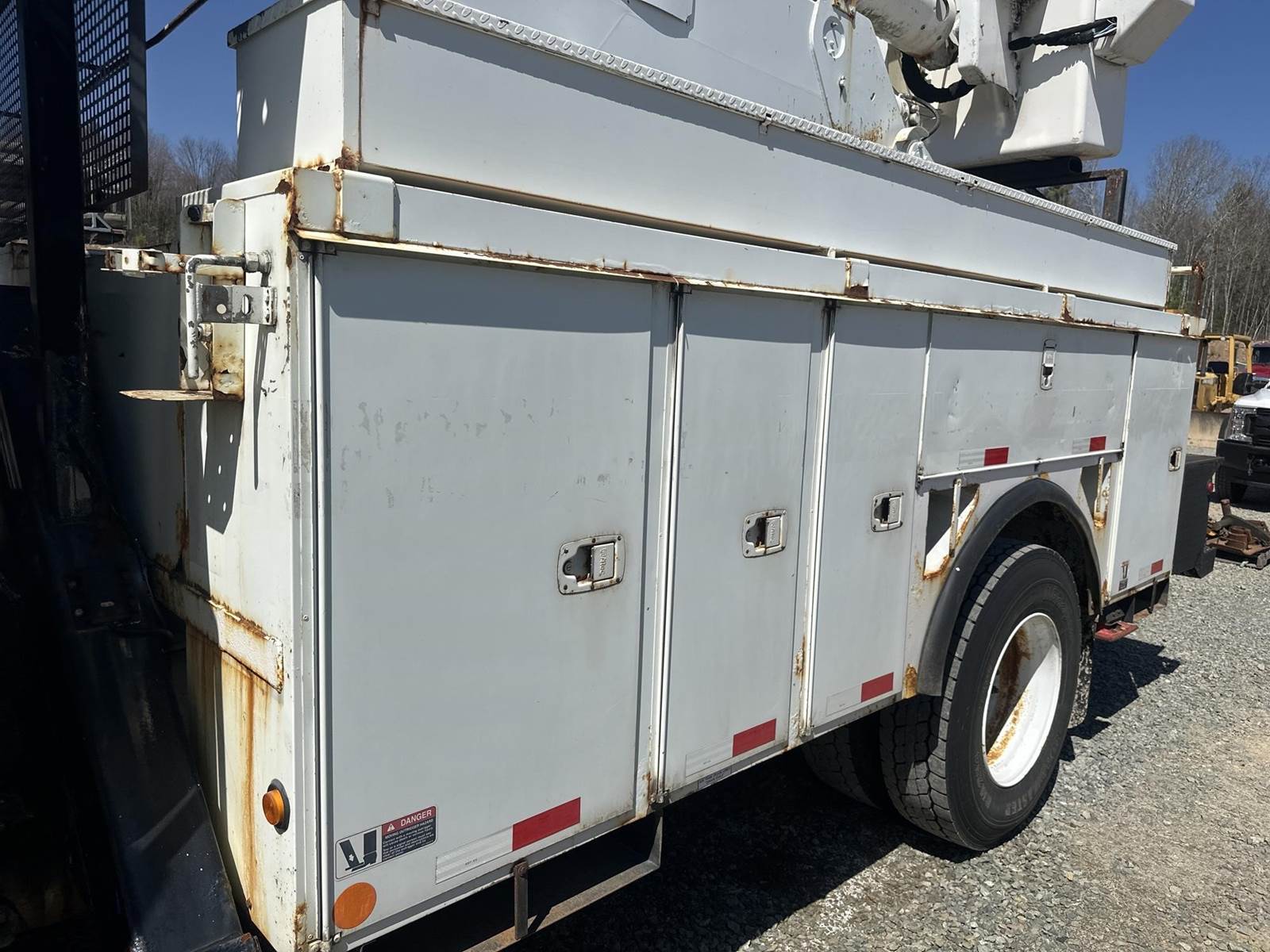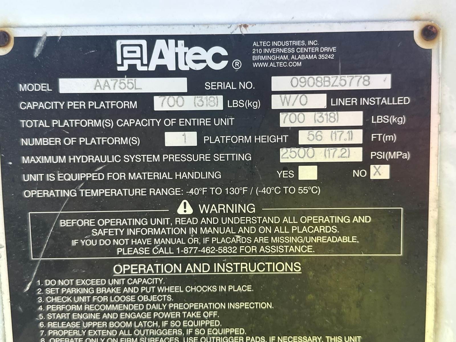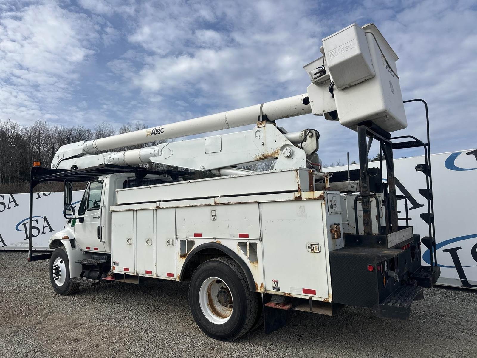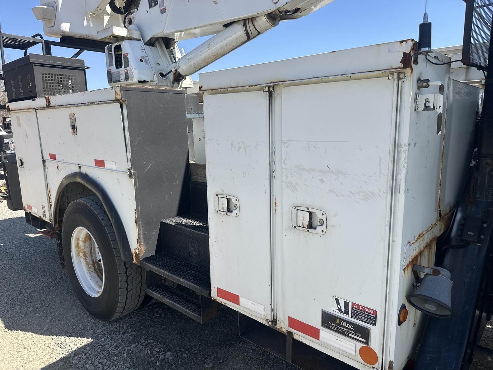MaxxForce DT255 Turbo Diesel Engine, International 6 PLUS Manual Transmission, GVWR: 33000LB, 13000LB Front Axle, Spring Ride, Differential Lock, PTO, (9) Door Service Body, Approx 15' Service Body Length, (4) Outriggers, Altec AA755L Lift, 700LB Platform Capacity, Approx 56' Max Platform Height, Upper and Lower Controls, Heat, A/C, Radio, Cruise Control, 11R22.5 Tires