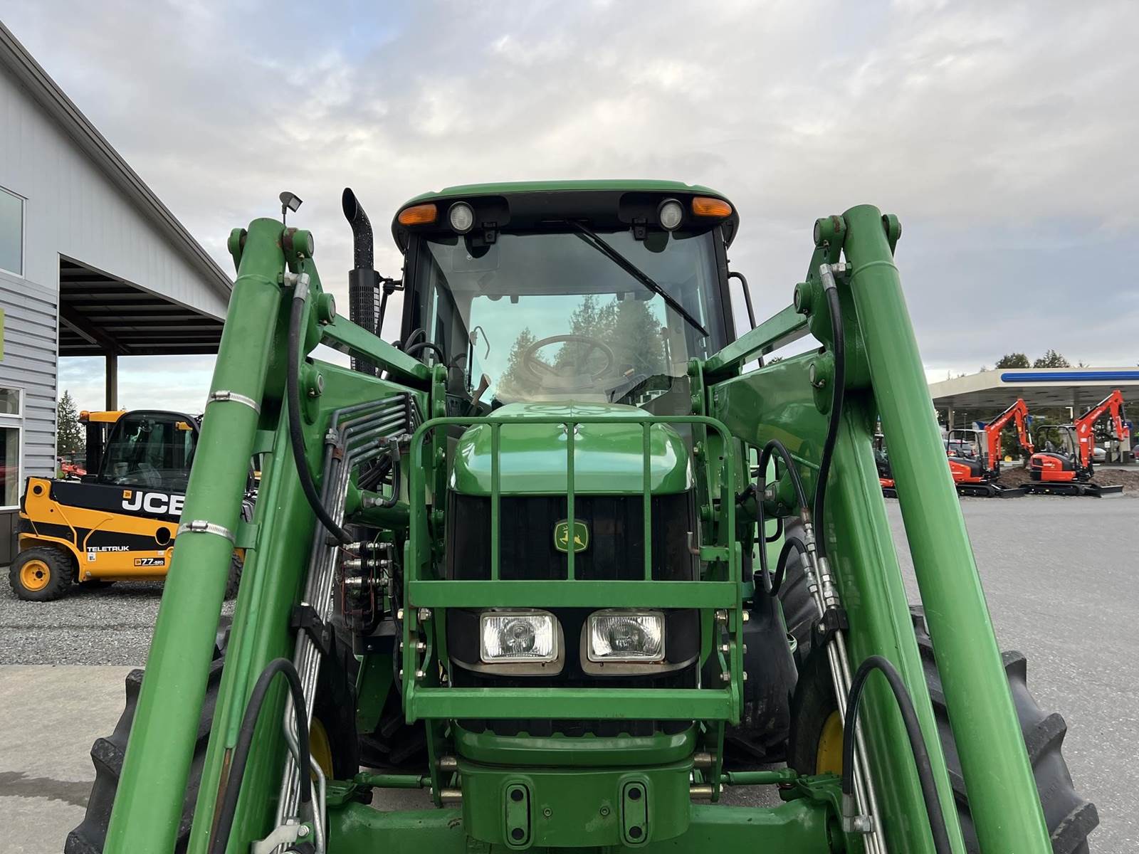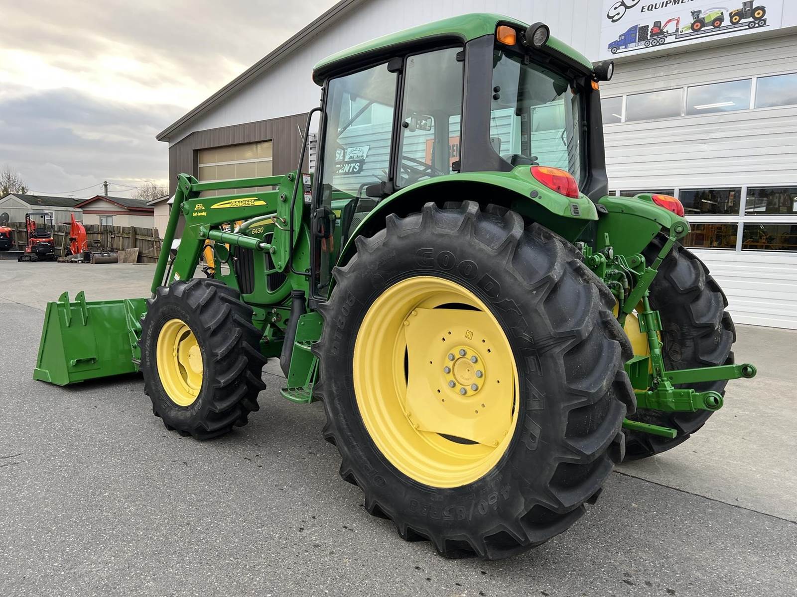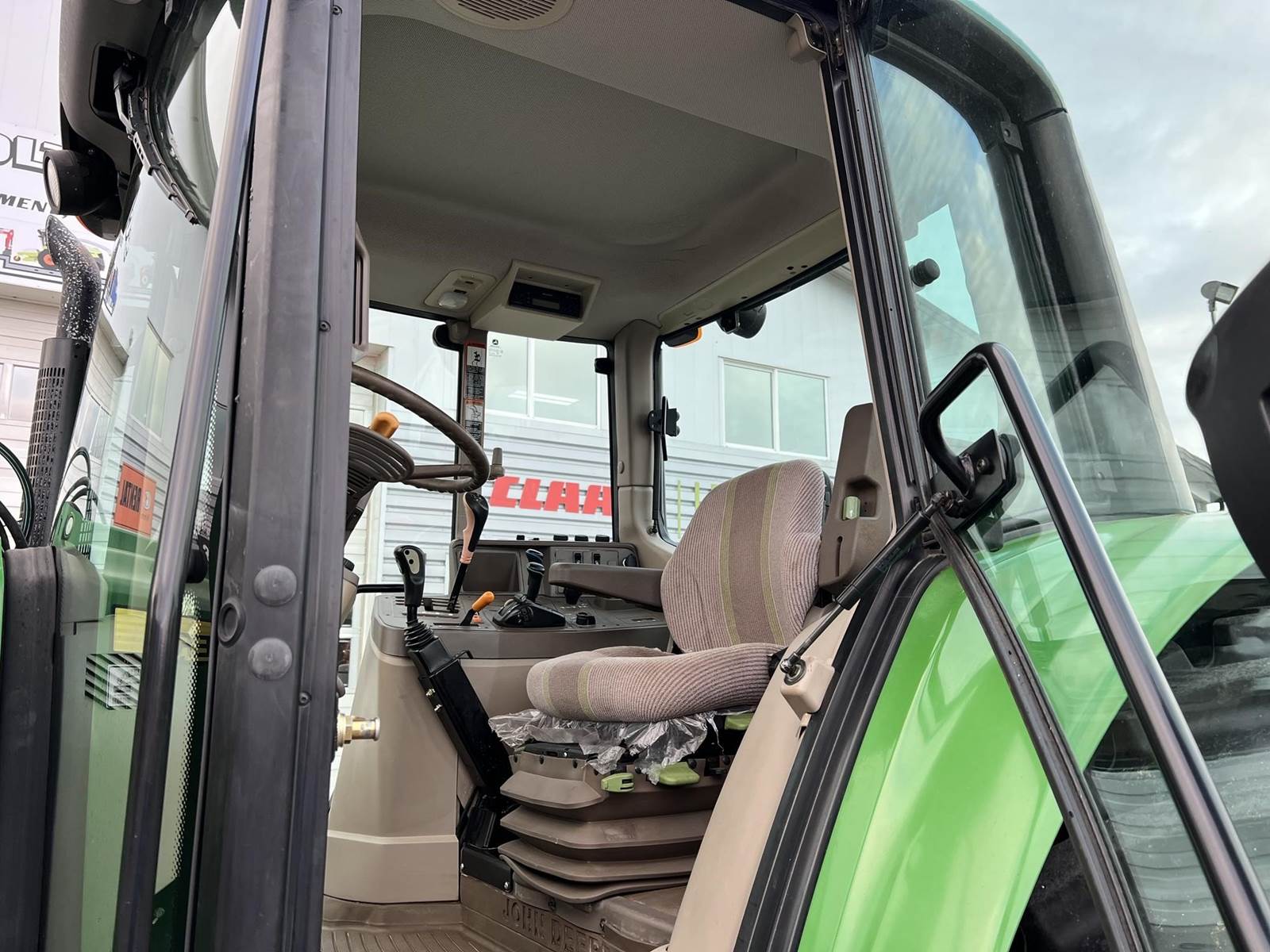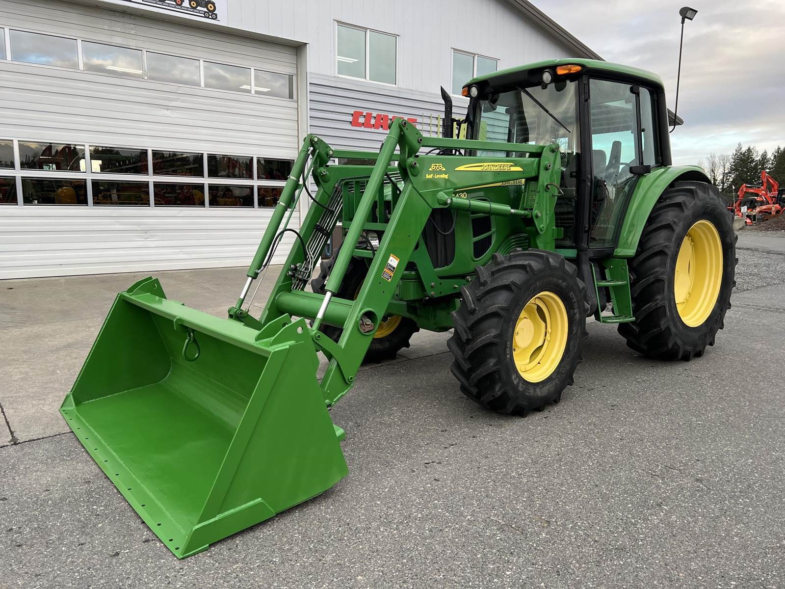 2009 JOHN DEERE Tractor - John Deere turbocharged diesel engine, PowrQuad partial power shift transmission with four gears in six ranges with left-hand reverser lever, 673 loader with bucket, 3rd function, 380/85R24 front tires, 460/85R38 rear tires, rear PTO, rear 3Pt., two rear remotes, cab, heat air conditioning, radio.