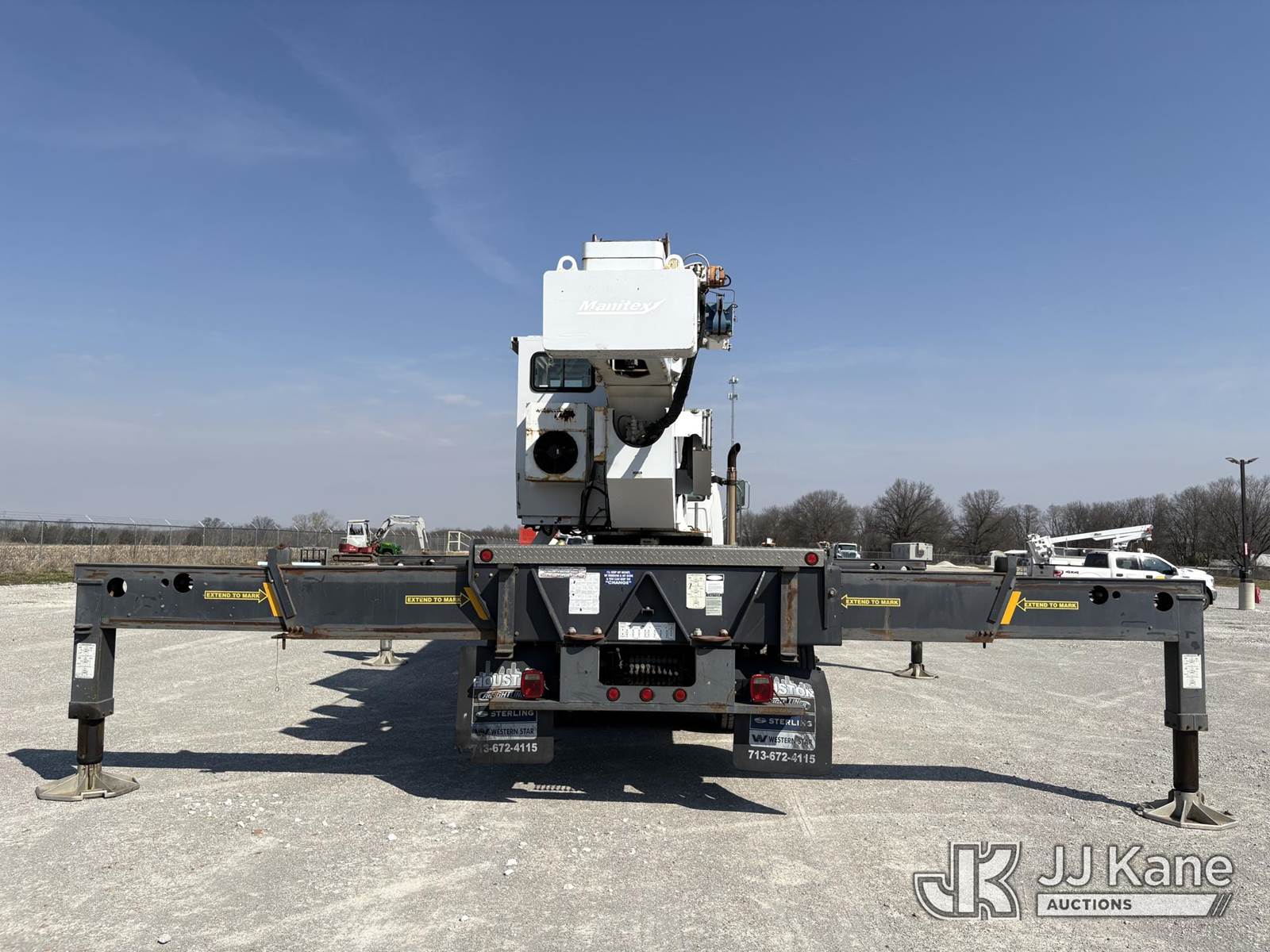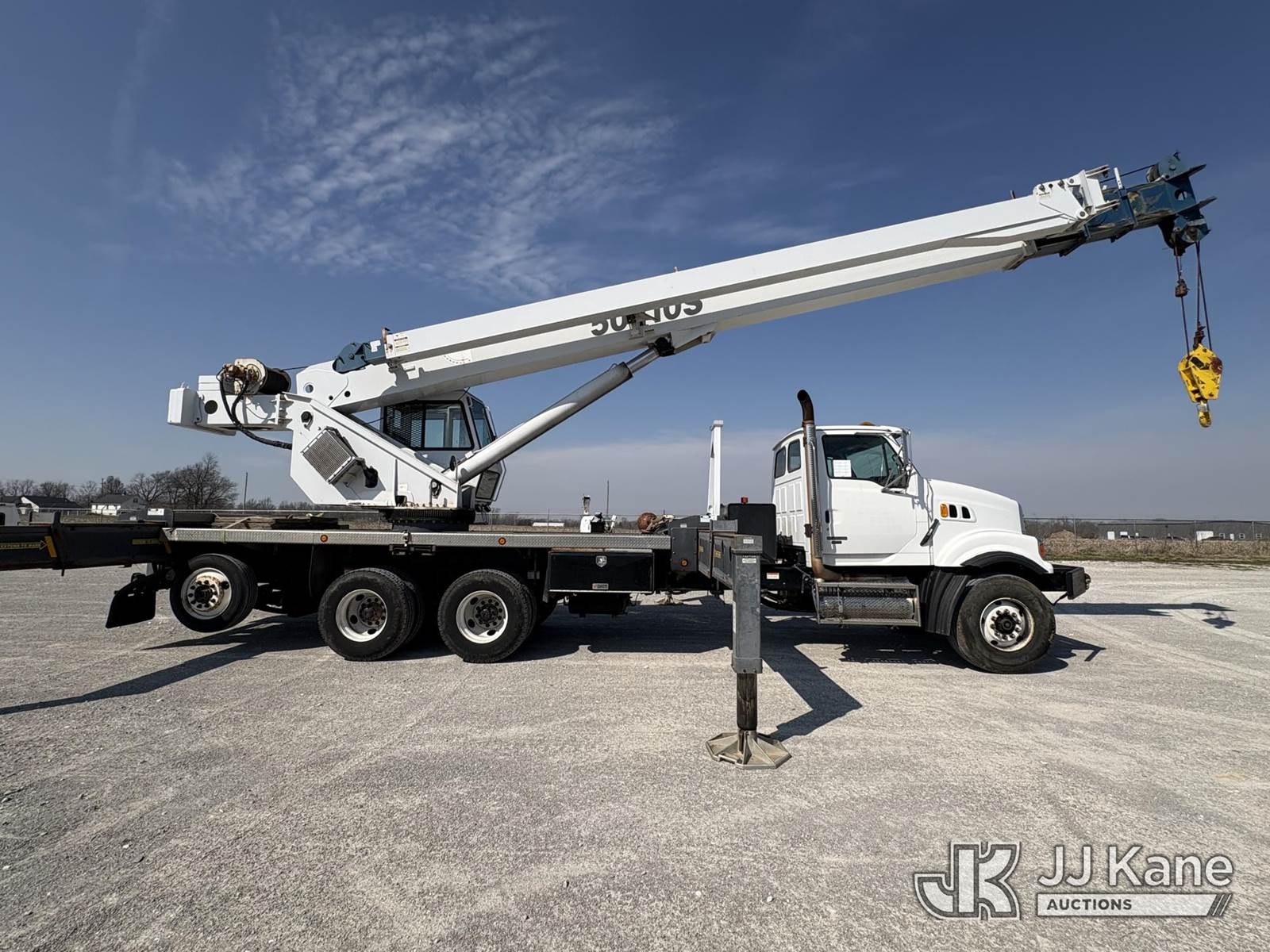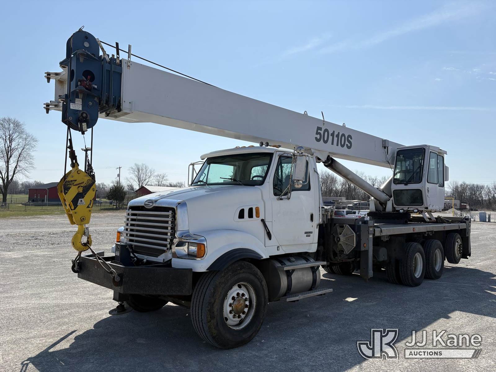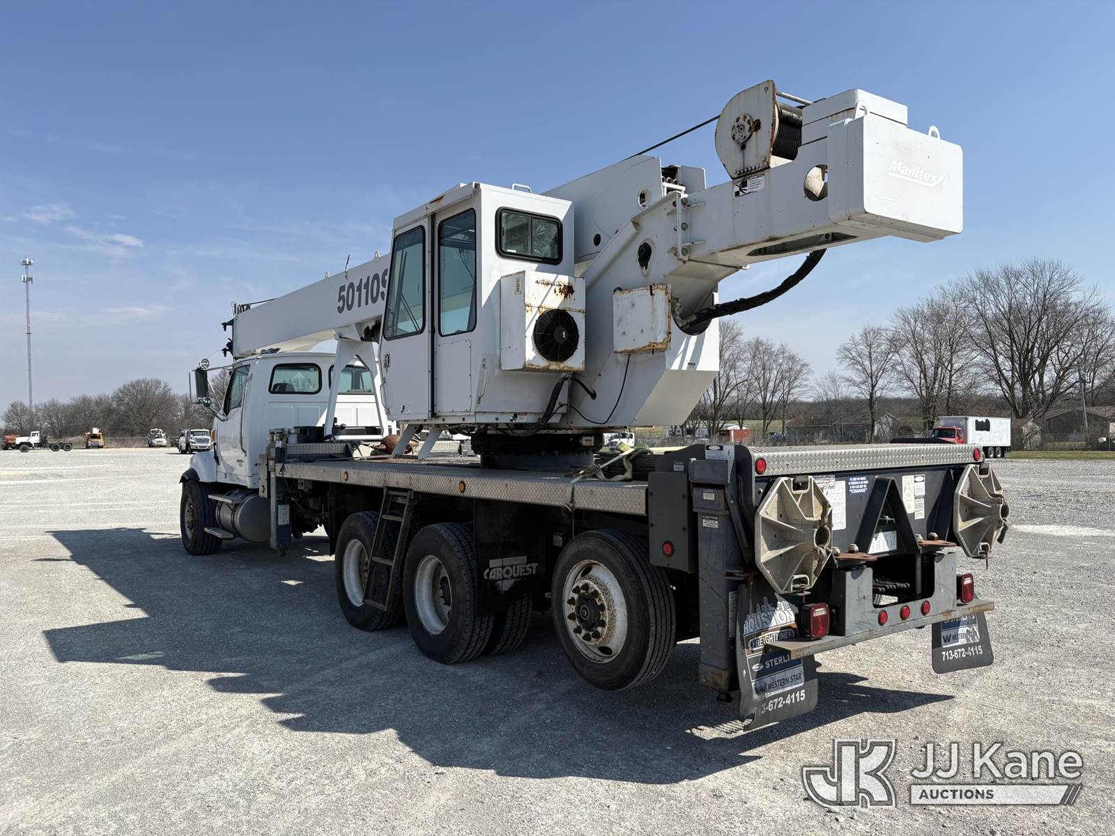 Manitex 50110, 50-Ton Hydraulic Crane s/n 154736, with 34 ft to 110 ft 4-section boom, 32 ft to 49 ft extendable swing-away jib, heel winch, anti-two block, hook block, hook ball, Hirschmann LMI, 5 hydraulic outriggers & enclosed cab, rear mounted on 2009 Sterling Acterra Tri-Axle Flatbed Truck, s/n 2FZMAZCV59AAD2146, Mercedes-Benz diesel, manual, A/C, (120,377 miles) (Runs, Moves & Upper Operates) (Lower Glass Busted On Crane Cab) (Reads 14,272 hours) NOTE: This unit is being sold AS IS/WHERE IS via Timed Auction and is located in Hawk Point, MO. Inspection & preview days for this unit are the 2 business days prior to the first day of items closing for this auction, item is located at 25 State Highway A Hawk Point, MO 63349 and hours of operations are 8a-4p. For pre-sale questions, please contact Adam Stanek at (636) 295-1594. (Missing manuals, See Auction Company for Manufacturers Information to obtain manuals) (Buyer is responsible for removal. Assistance by consignor or JJ Kane Auctions is not assured.)