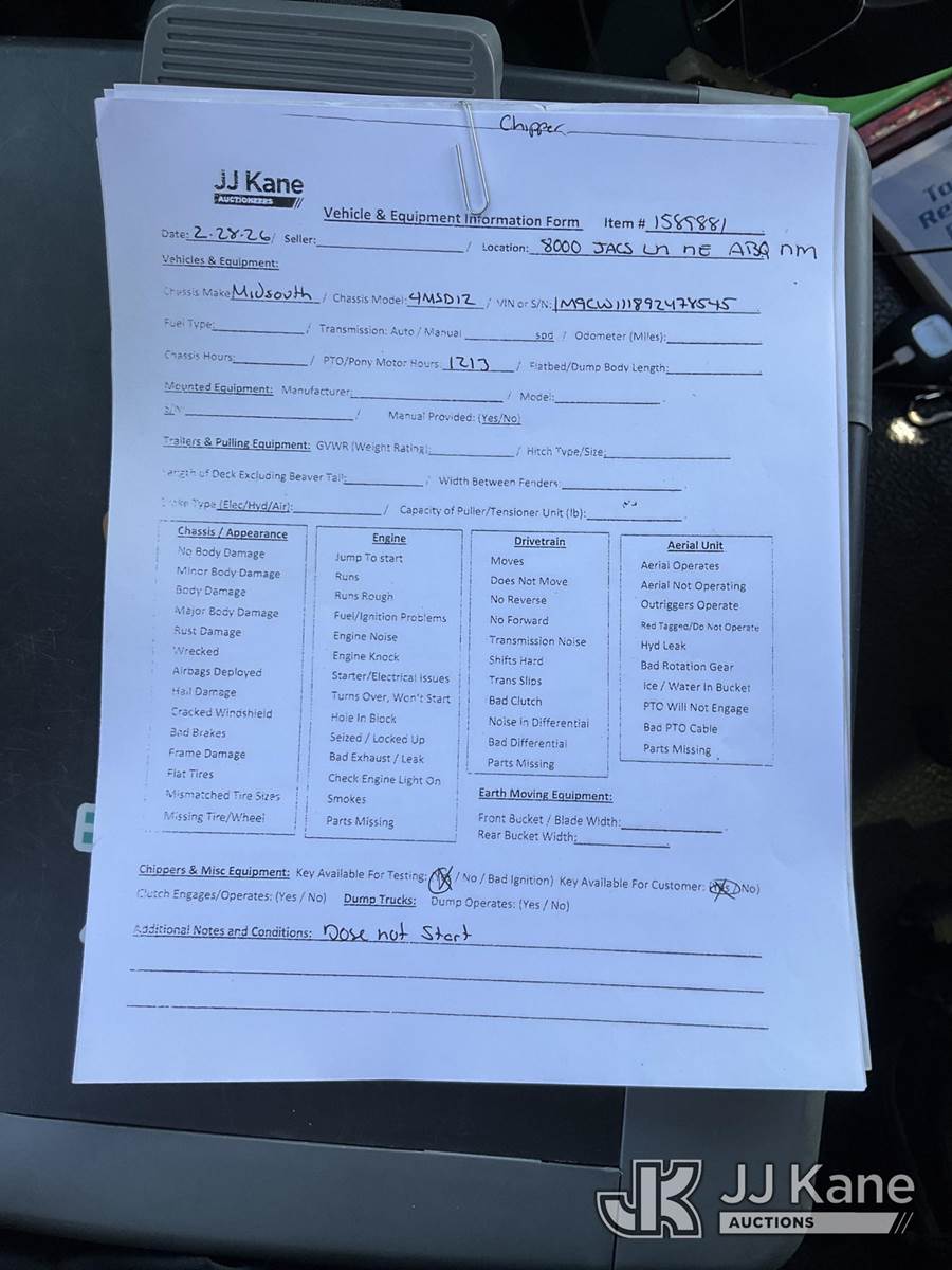 2009 Midsouth 4MSD12 Chipper (12in Drum), gas, (Not Running, Condition Unknown) (Seller States: engine needs to be repaired) (Reads 1,213 hours) This is a Titled Item NOTE: This unit is being sold AS IS/WHERE IS via Timed Auction and is located in Albuquerque, NM. Inspection & preview days for this unit are by appointment only; please contact us at contact@jjkane.com or 84-Go-JJKane for more details. (Buyer is responsible for removal. Assistance by consignor or JJ Kane Auctions is not assured.)