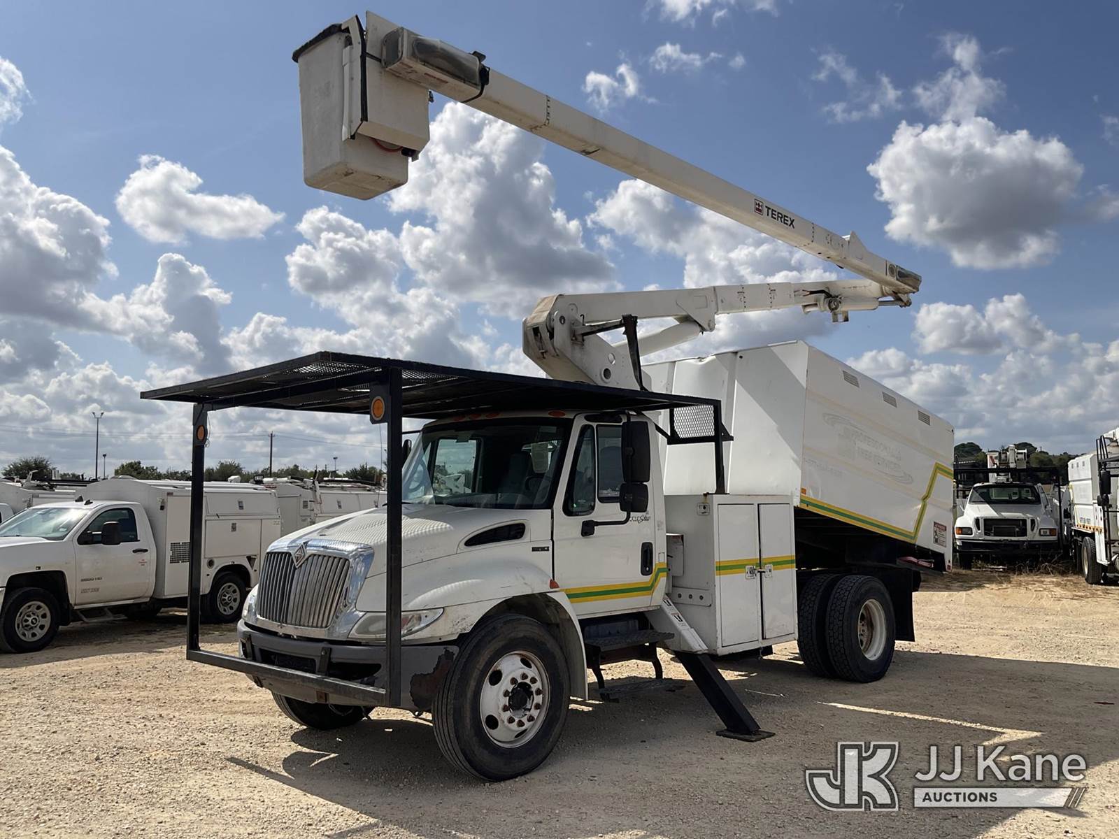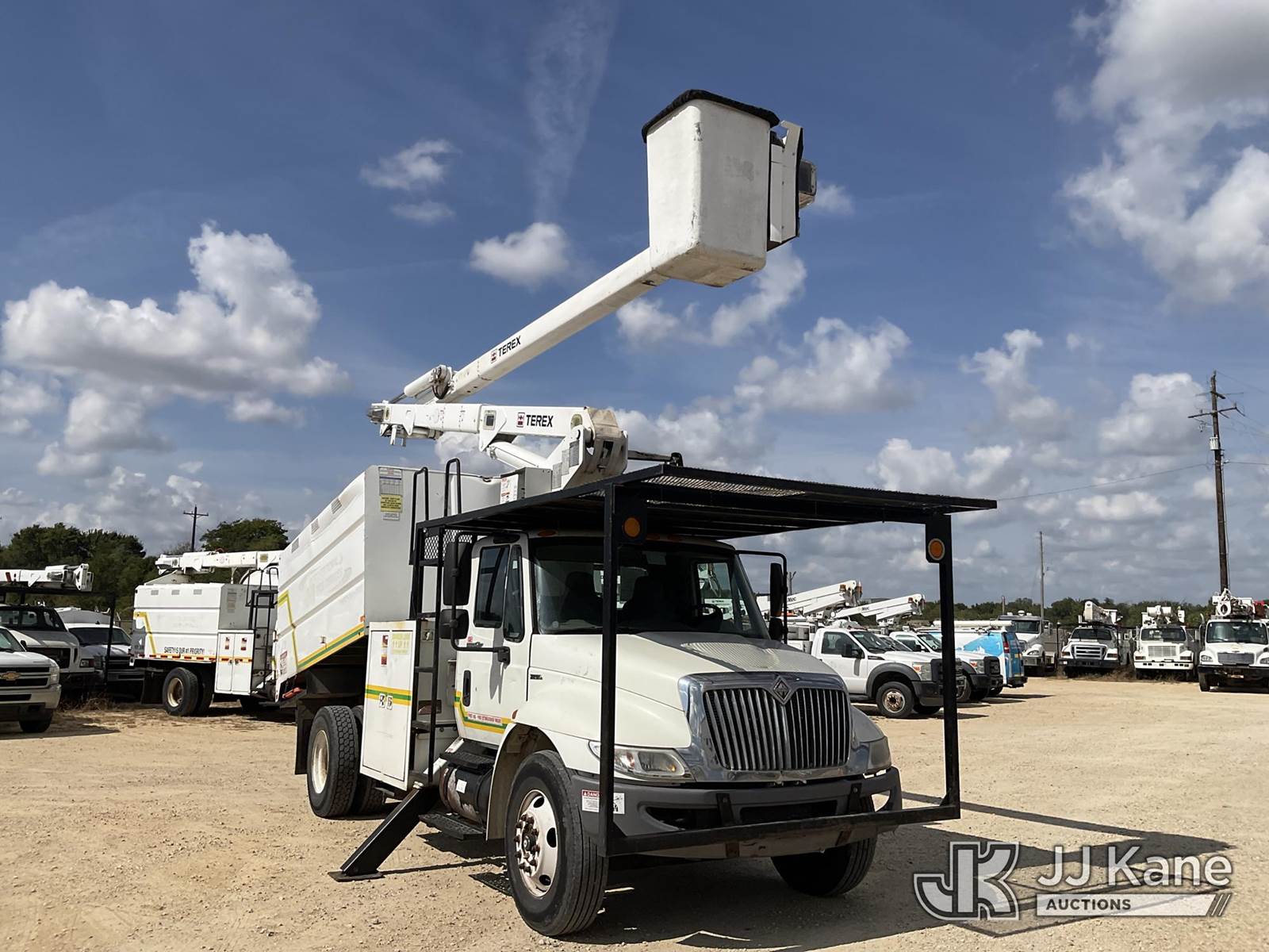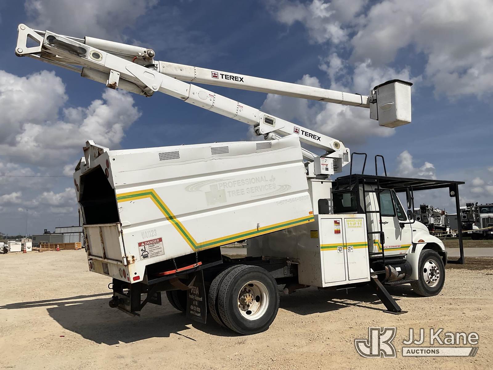 Terex XT55, 60 ft, Over-Center Bucket Truck s/n 2100441255, with single-man bucket, two hyd. outriggers, mounted behind cab on 2009 International 4300 Chipper Dump Truck, 7.6L L6 DIESEL manual, 4X2, A/C, (70,598 miles) (Runs, Moves, & Upper Operates) This is a Titled Item NOTE: This unit is being sold AS IS/WHERE IS via Timed Auction and is located in Houston, TX. For more information & removal arrangements please contact office staff @ (281) 841-0069. (Missing manuals, See Auction Company for Manufacturers Information to obtain manuals) (Buyer is responsible for removal. Assistance by consignor or JJ Kane Auctioneers is not assured.)
