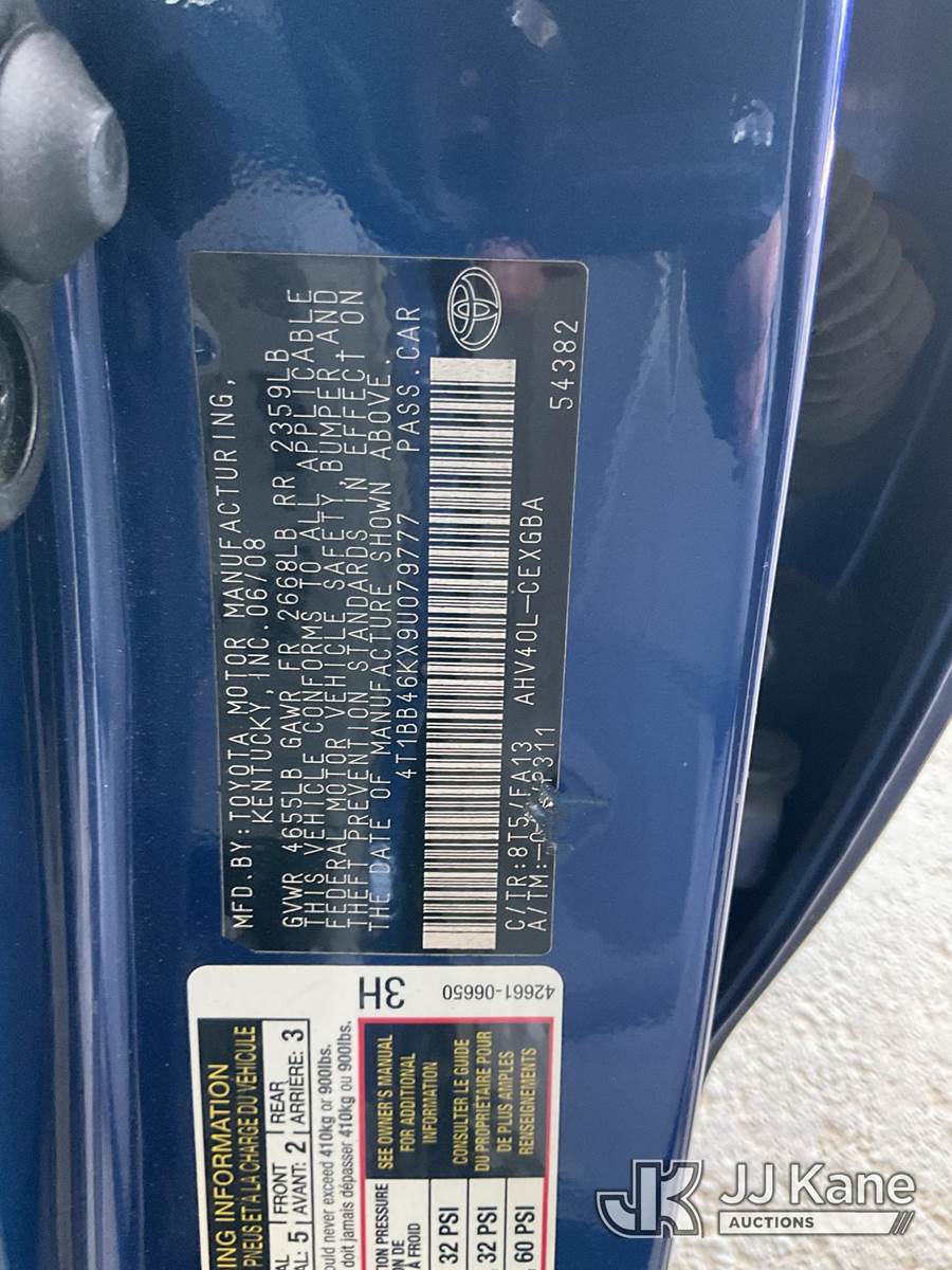 2009 Toyota Camry "Hybrid" 4-Door Sedan, s/n 4T1BB46KX9U079777, 4-cyl Gas/Electric, Continuously Variable Transmission, A/C, (106,168 miles) (Runs & Moves) (Clear Coat Peeling) This is a Titled Item NOTE: This unit is being sold AS IS/WHERE IS via Timed Auction and is located in Jurupa Valley, CA. Inspection & preview days for this unit are the 2 business days prior to the first day of items closing for this auction, item is located at 4510 Muth Way Jurupa Valley, CA 92509 and hours of operations are 8a-4p. For pre-sale questions, please contact please contact Office Staff @ (310) 353-7140. Dealer License Number 45696. (Buyer is responsible for removal. Assistance by consignor or JJ Kane Auctions is not assured.)